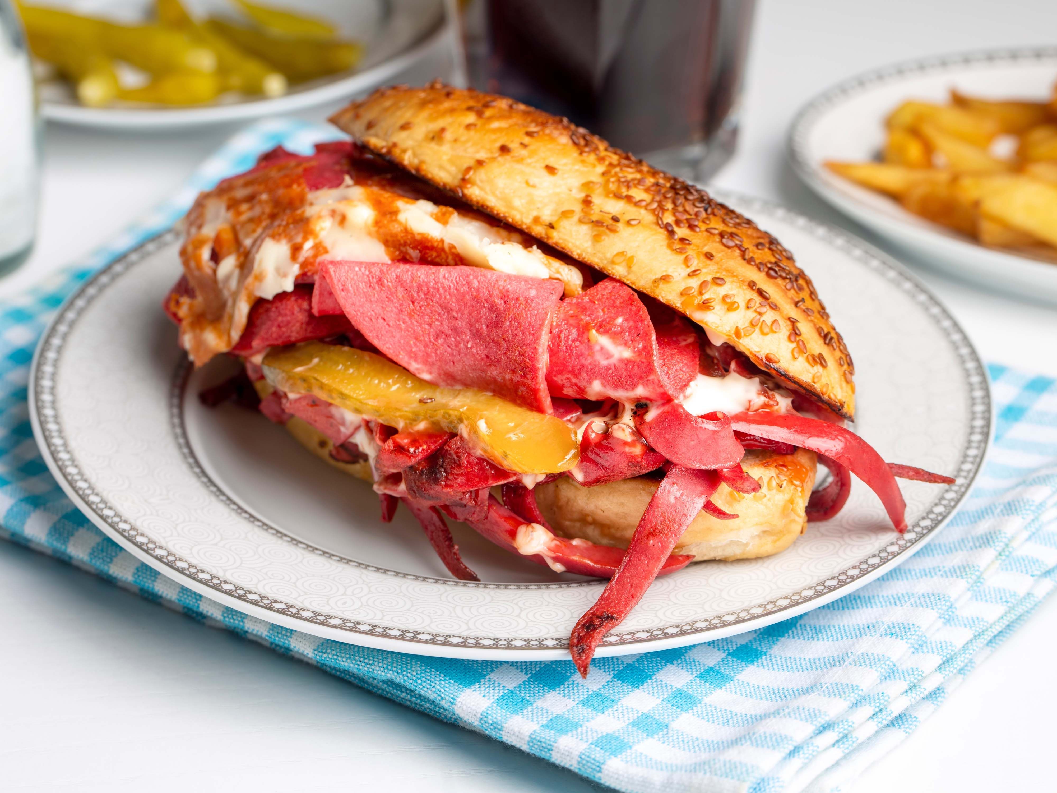 Kaşar peyniri, salam, sucuk, Rus salatası, domates, turşu