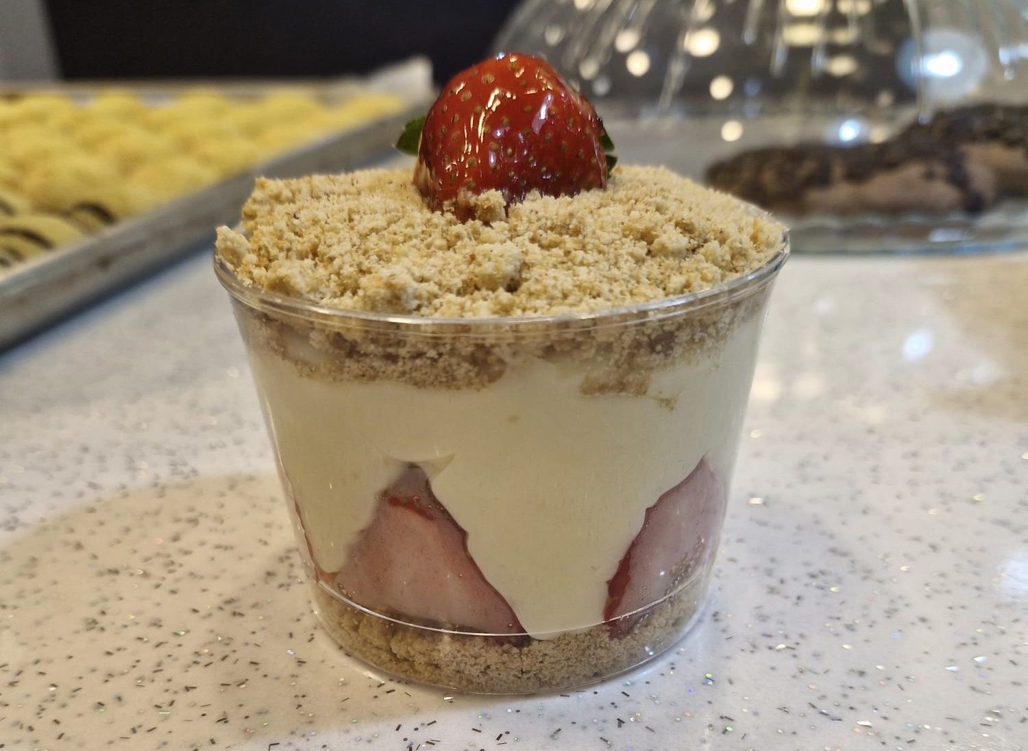(Cam kavanozda servis edilir.) Bisküvi, özel mag kreması, profiterol sos, çilek