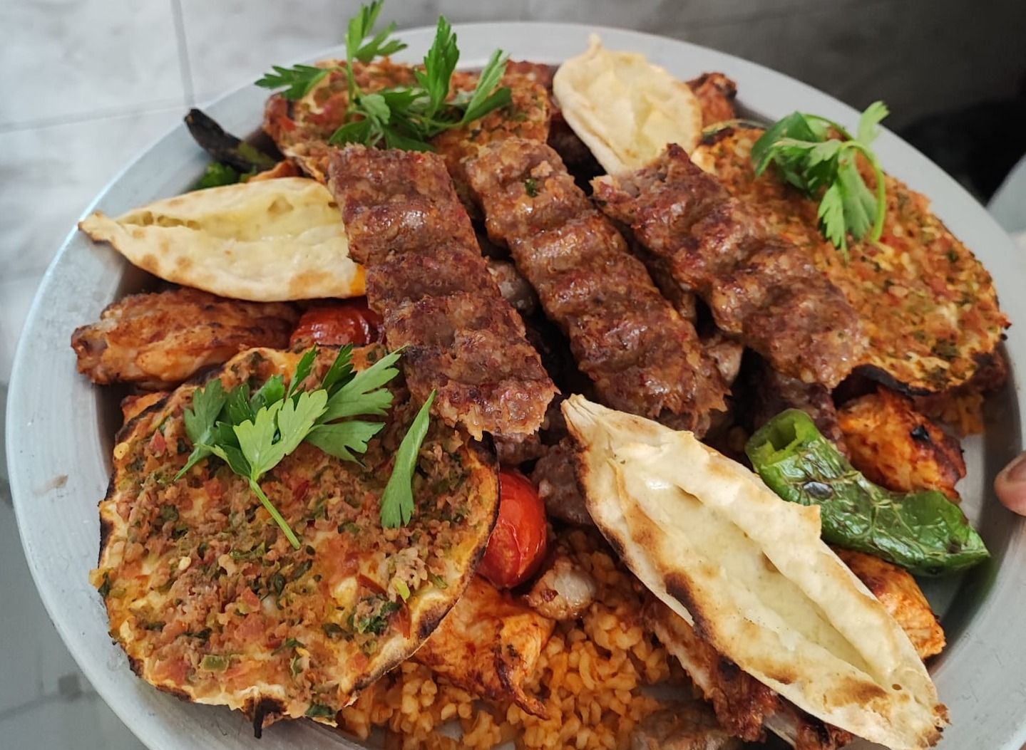 Adana kebap, tavuk şiş, tavuk kanat, çöp şiş, domates, fındık lahmacun, kaşarlı pide. Közlenmiş biber, közlenmiş domates, sumaklı soğan, çoban salata, çiğ köfte, lavaş ekmeği ile