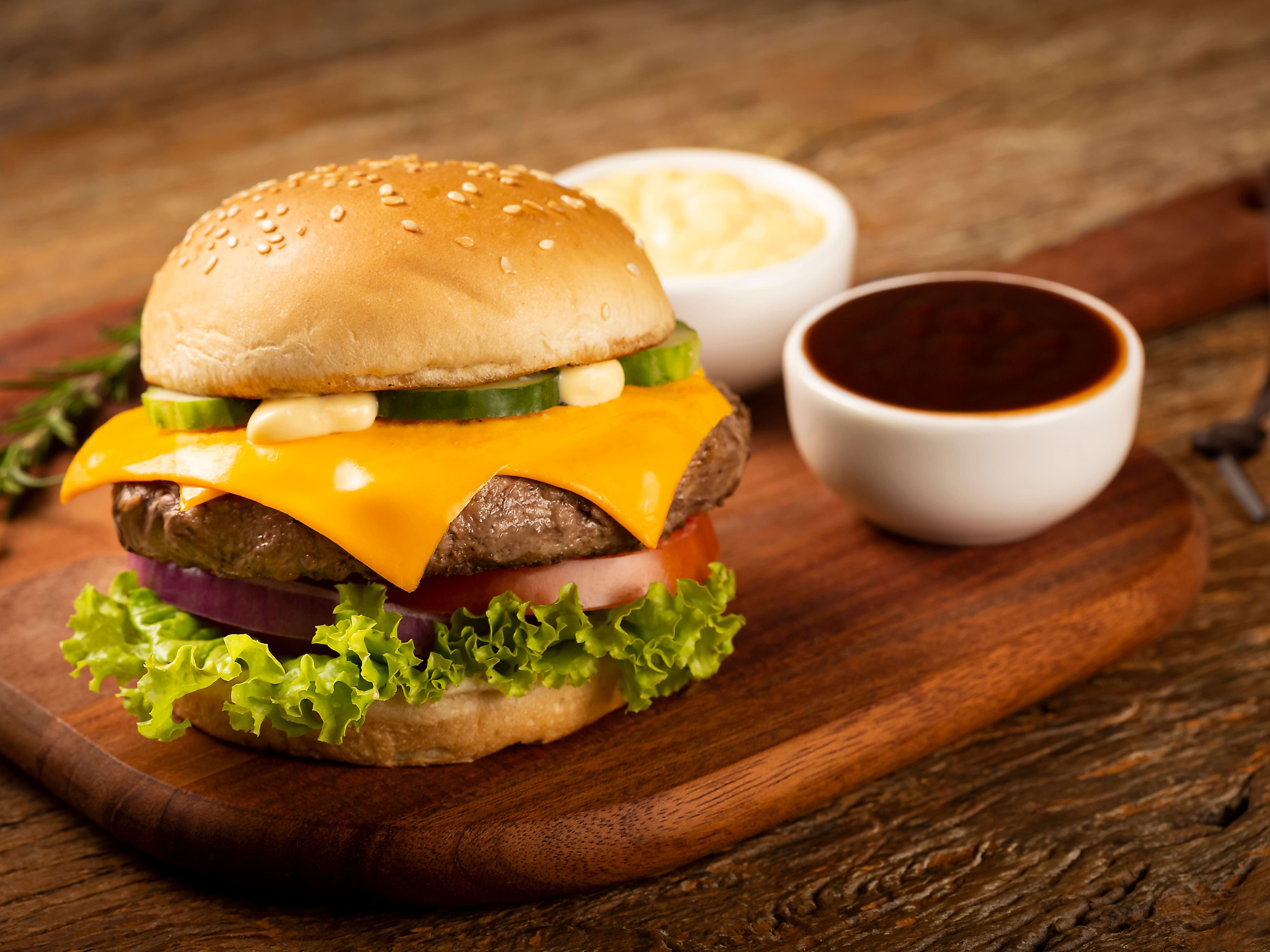 Burger köftesi, cheddar peyniri, marul, soğan, salatalık turşusu. Baharatlı patates kızartması, nane sos ile
