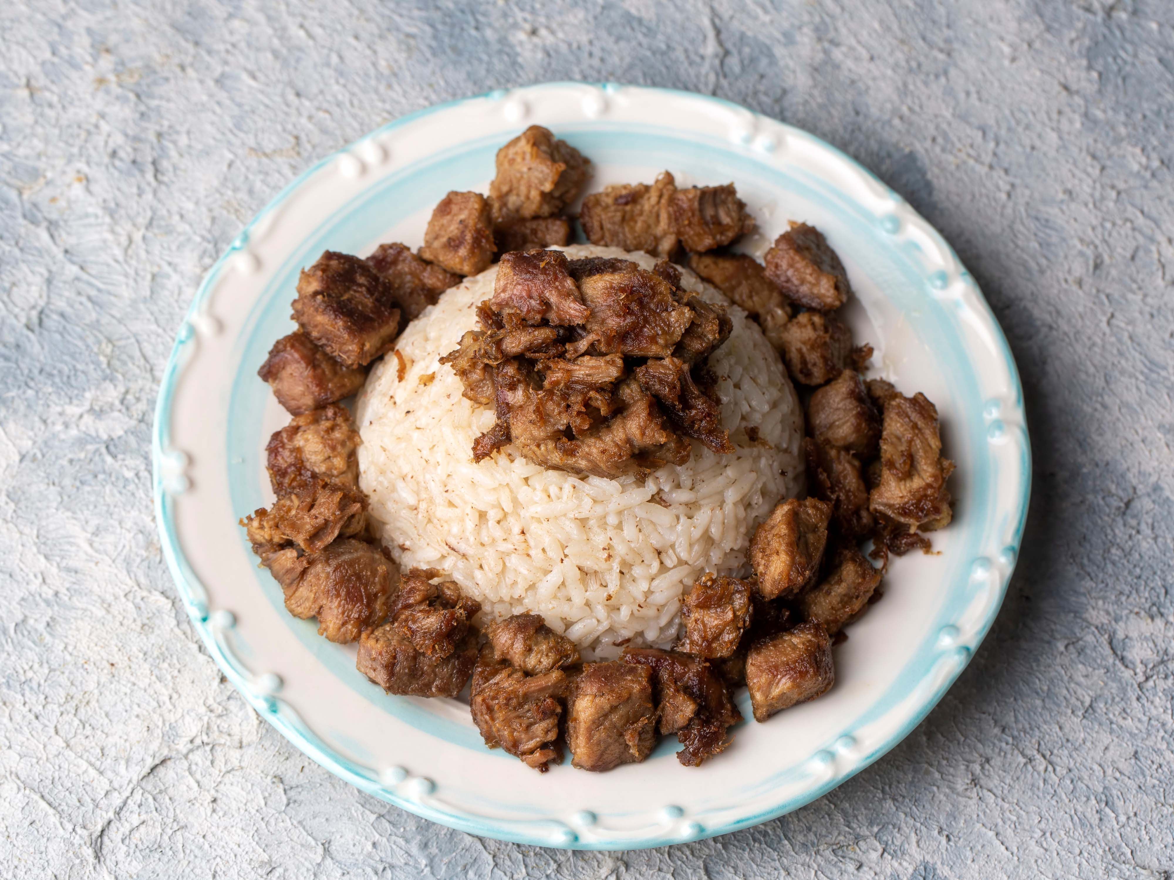120 gr. dana kavurma. Acılı sos, salatalık turşusu, biber turşusu, sumaklı soğan ile