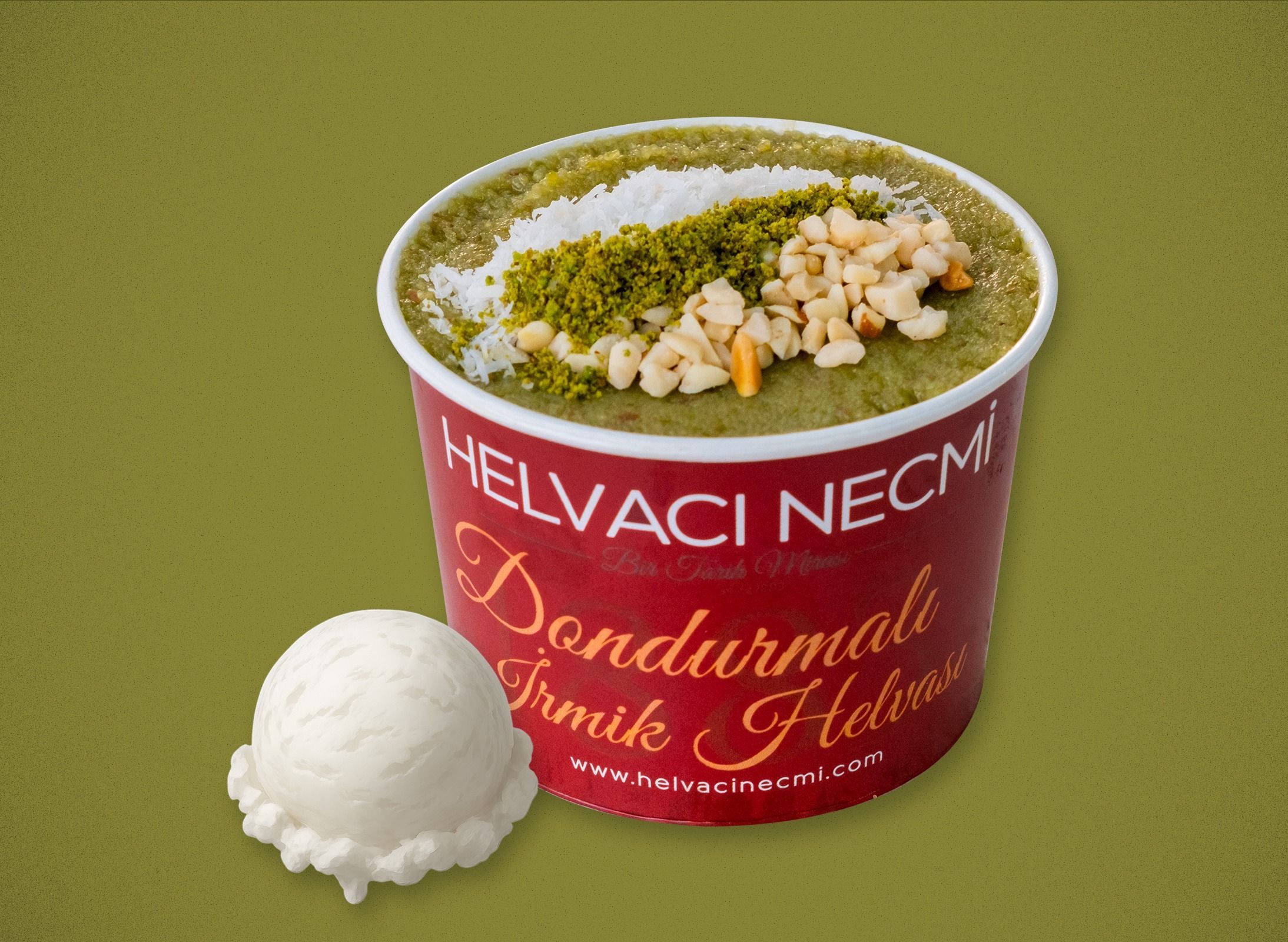 Maraş usulü dondurma üstüne; tereyağlı beyaz çikolatalı irmik helvası
