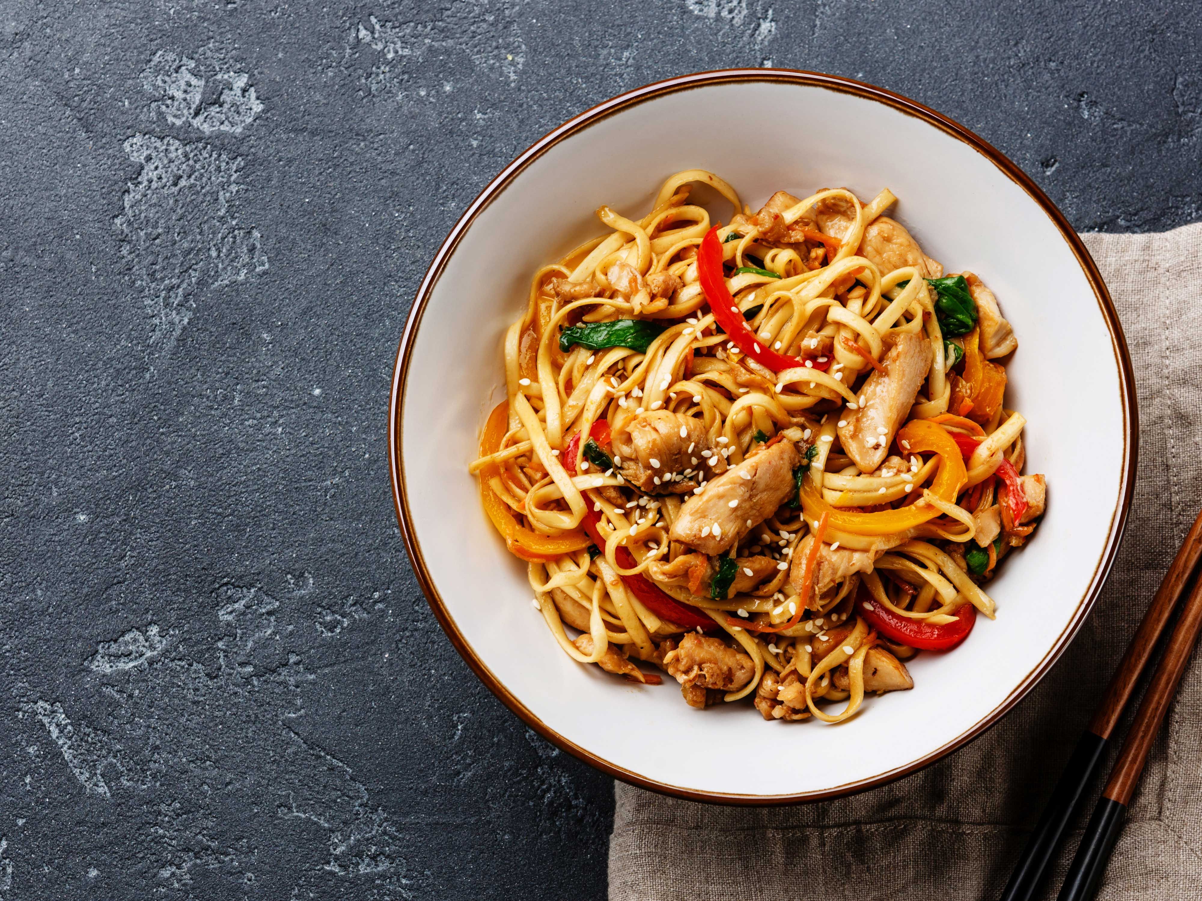 İnce pirinç eriştesi, mevsim sebzeleri, özel soslar