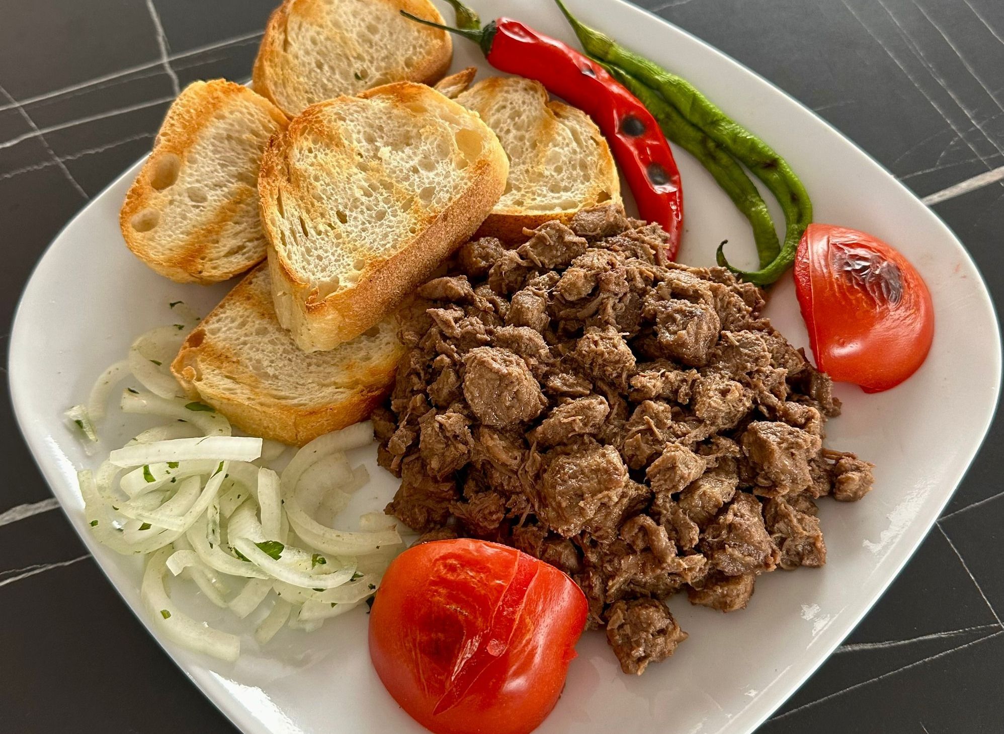 Odun ateşinde pişmiş dana kavurma. Közlenmiş biber, domates, soğan, yağlı kızarmış ekmek ile