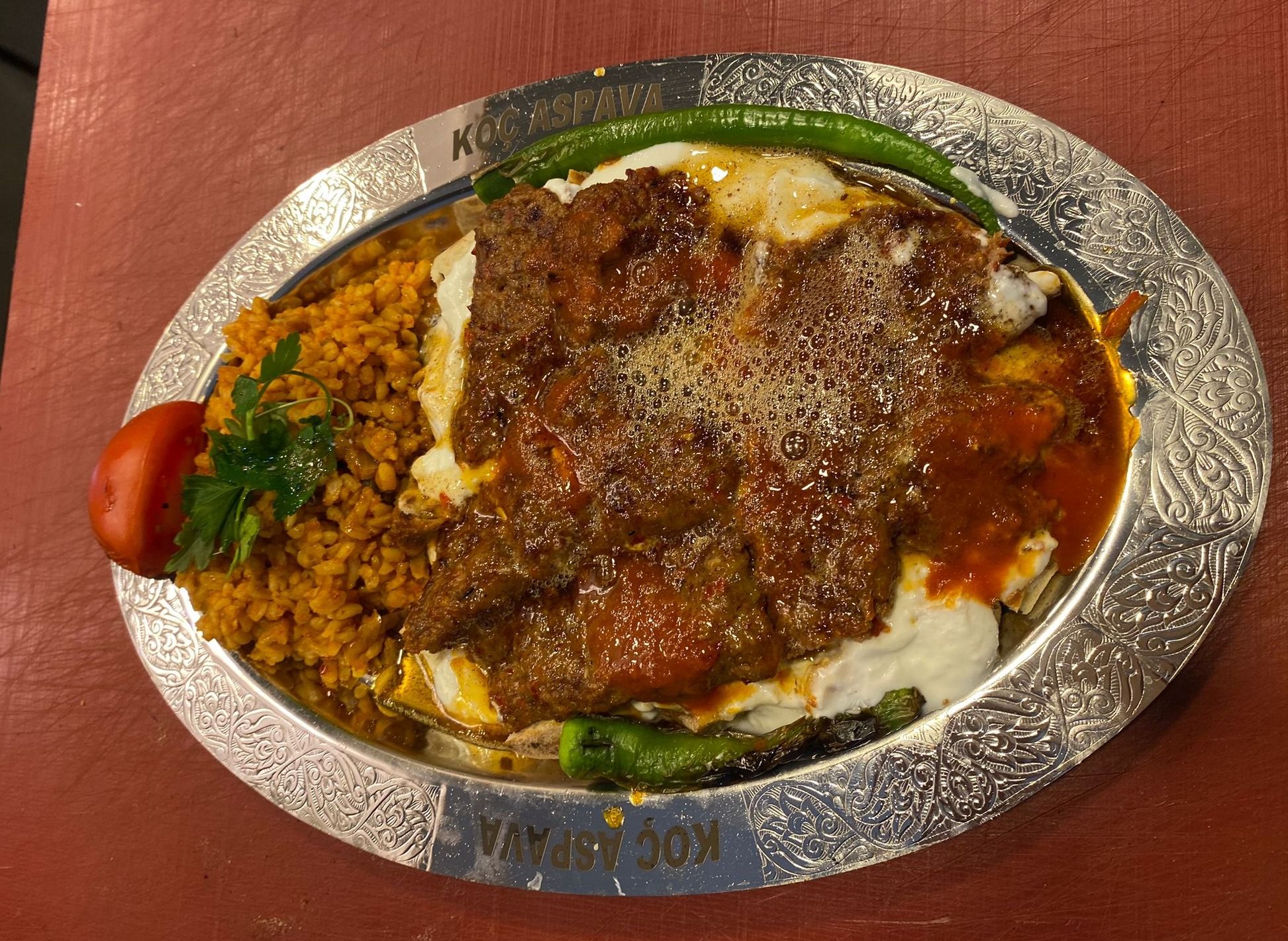 120 gr. et döner. Pilav, soğan ezme, cacık, mevsim salata, patates kızartması, irmik helvası ile