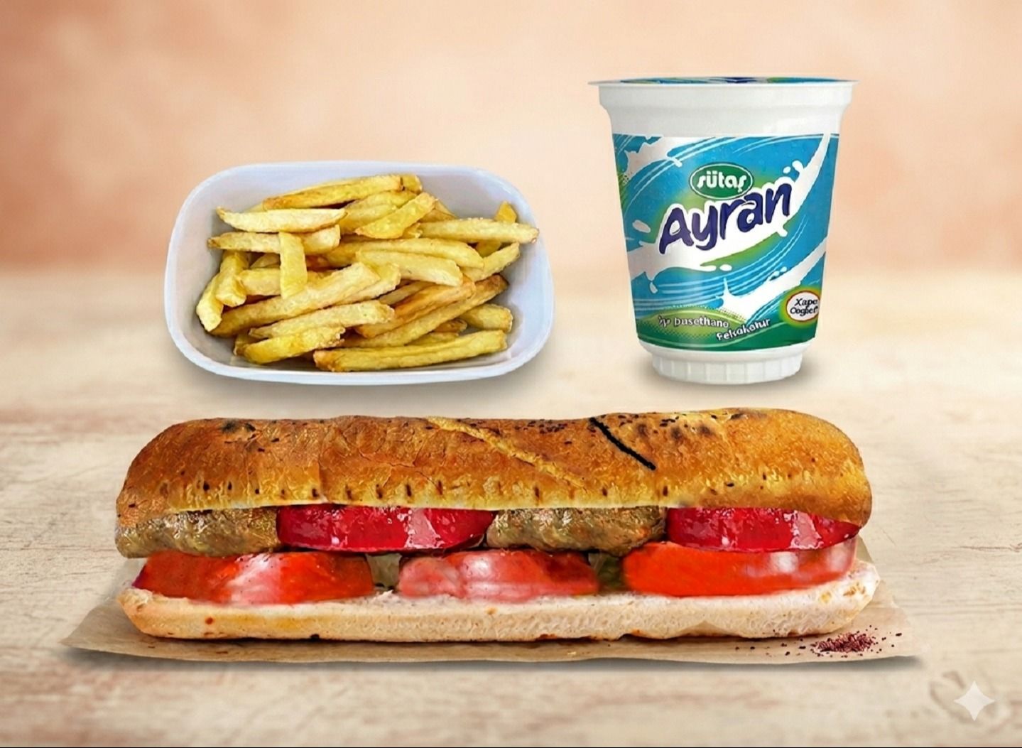 Ekmek Arası Sucuk + Patates Kızartması + Ayran (27 cl.)