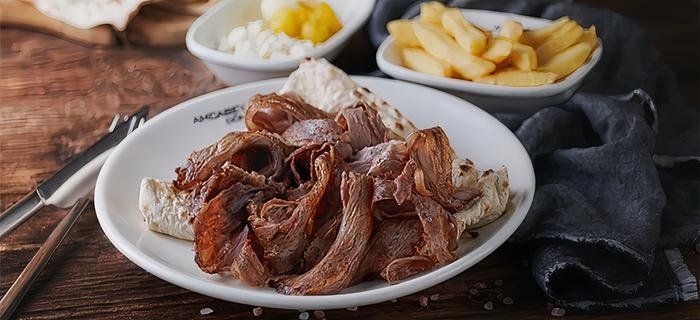120 gr. et döner, patates kızartması, lavaş ekmeği. İsteğe göre çiğ köfte, mevsim salata ile