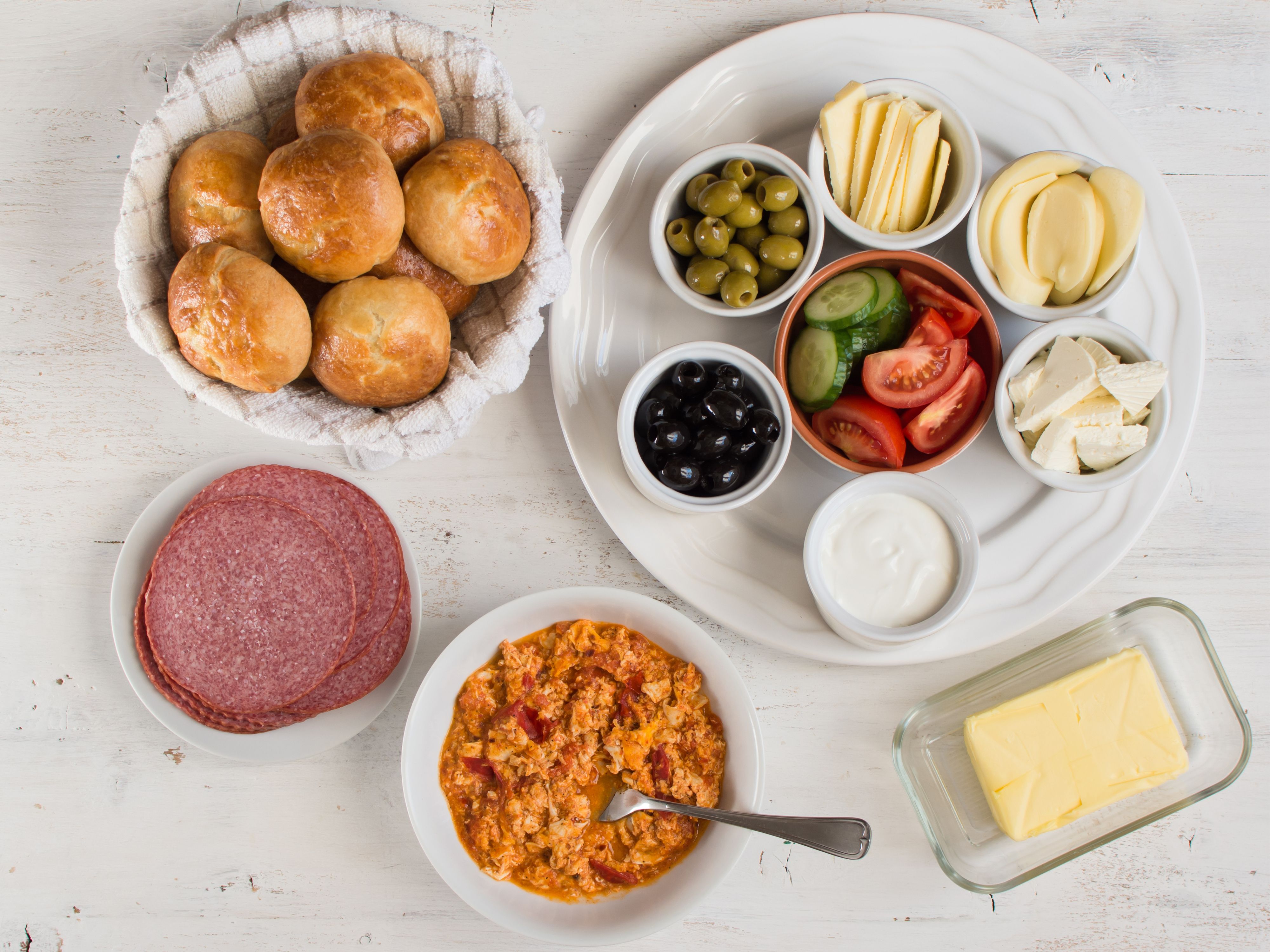 Beyaz peynir, kaşar peyniri, siyah zeytin, yeşil zeytin, reçel, tereyağı veya kaymak, salam, sucuk, bal, domates, salatalık, haşlanmış yumurta, patates kızartması
