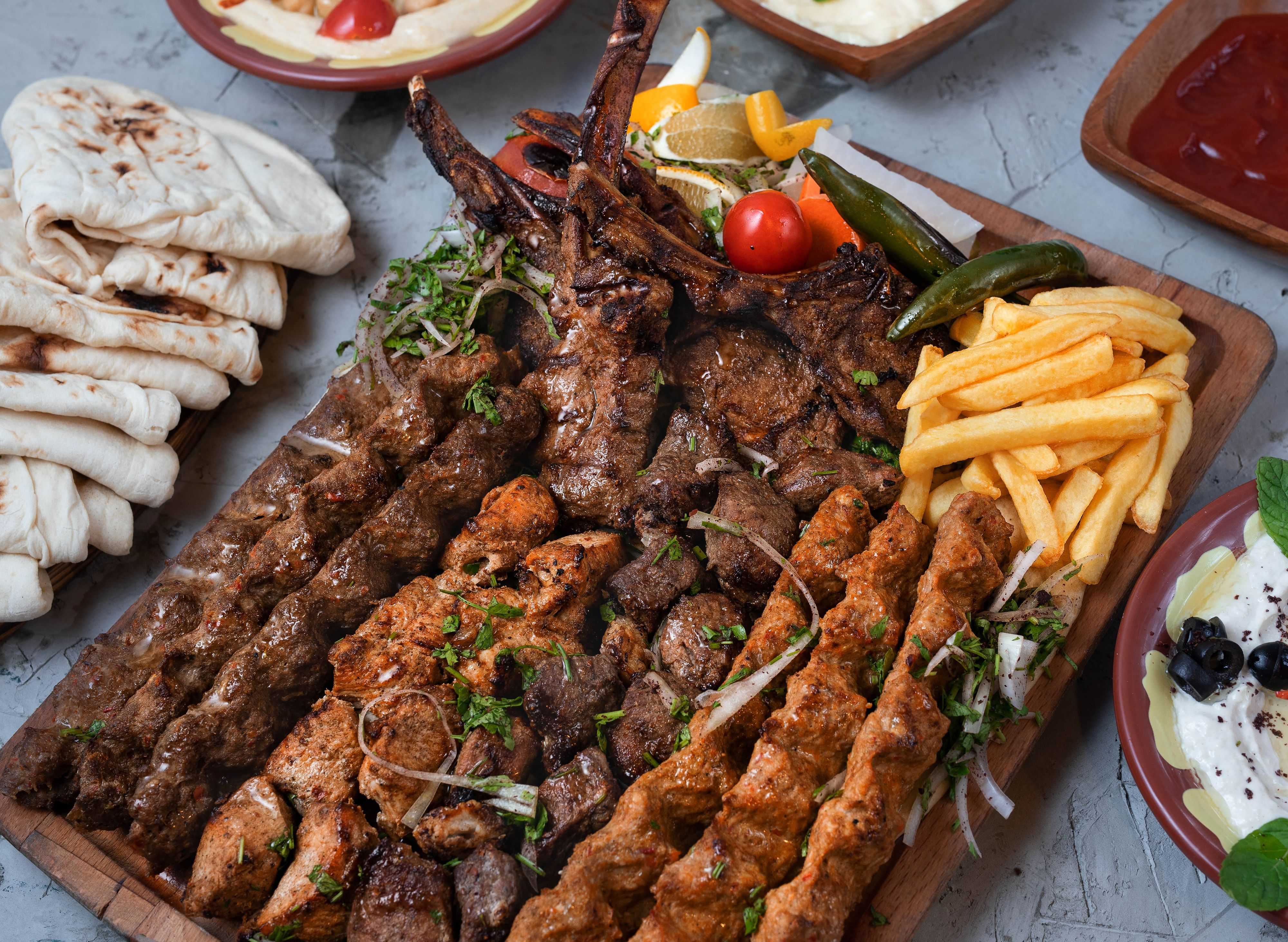 Tavuk kanat, Adana kebap, ızgara köfte, tavuk şiş, ciğer şiş, pirinç pilavı, haydari, ezme, çiğ köfte, lavaş ile
