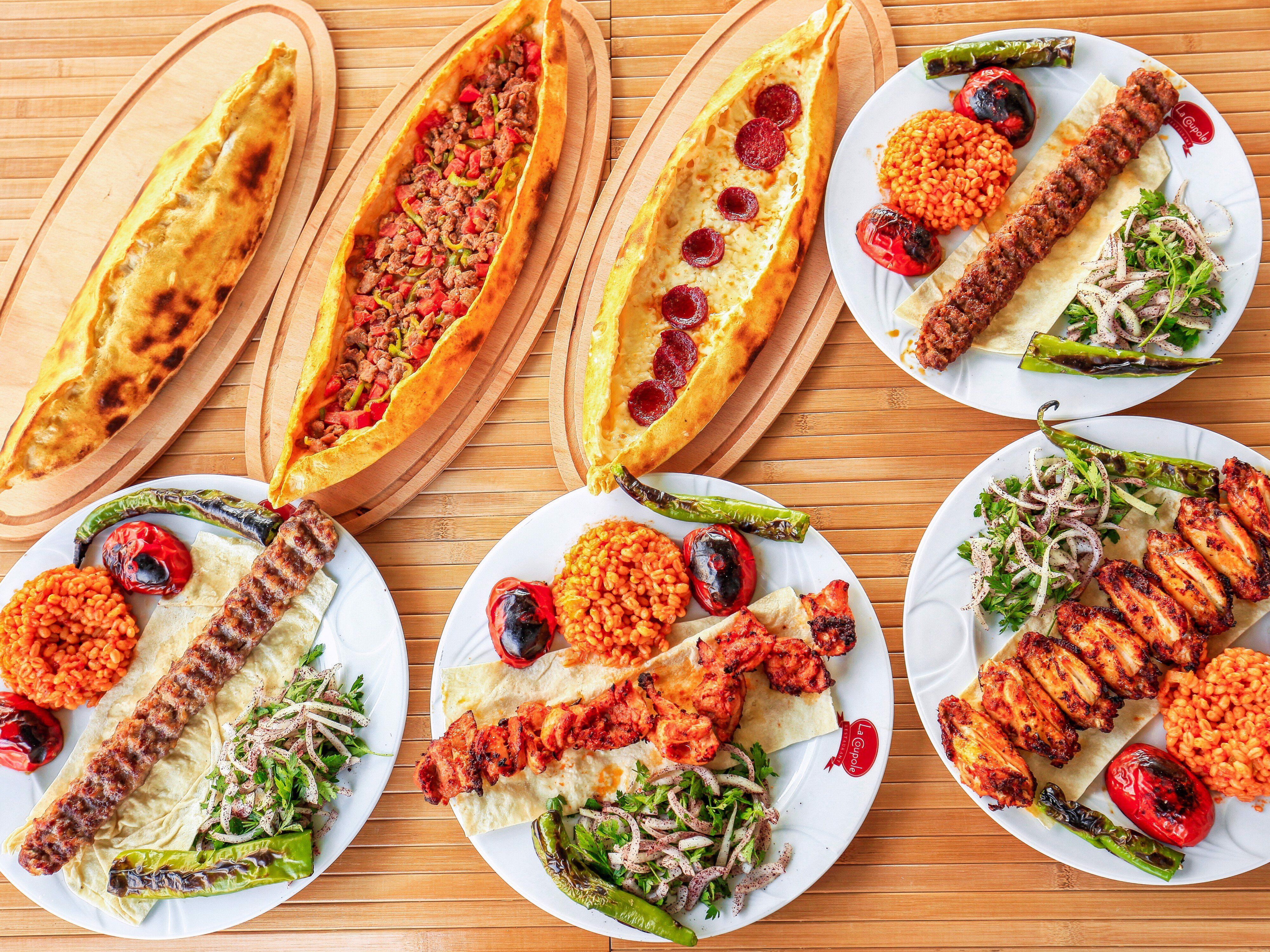 Kuzu şiş, tavuk şiş, tavuk kanat, kuzu lokum, domatesli kebap, Adana kebap. pilav sumaklı soğan, közlenmiş domates, biber, lavaş, ezme, haydari, salata ile