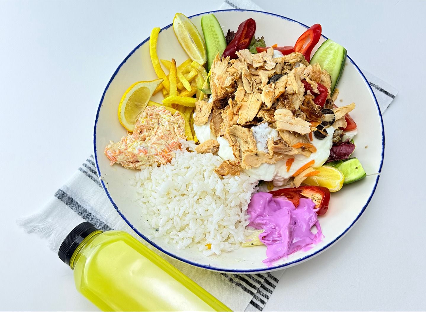 Patates kızartması, pirinç pilavı, turşu ile