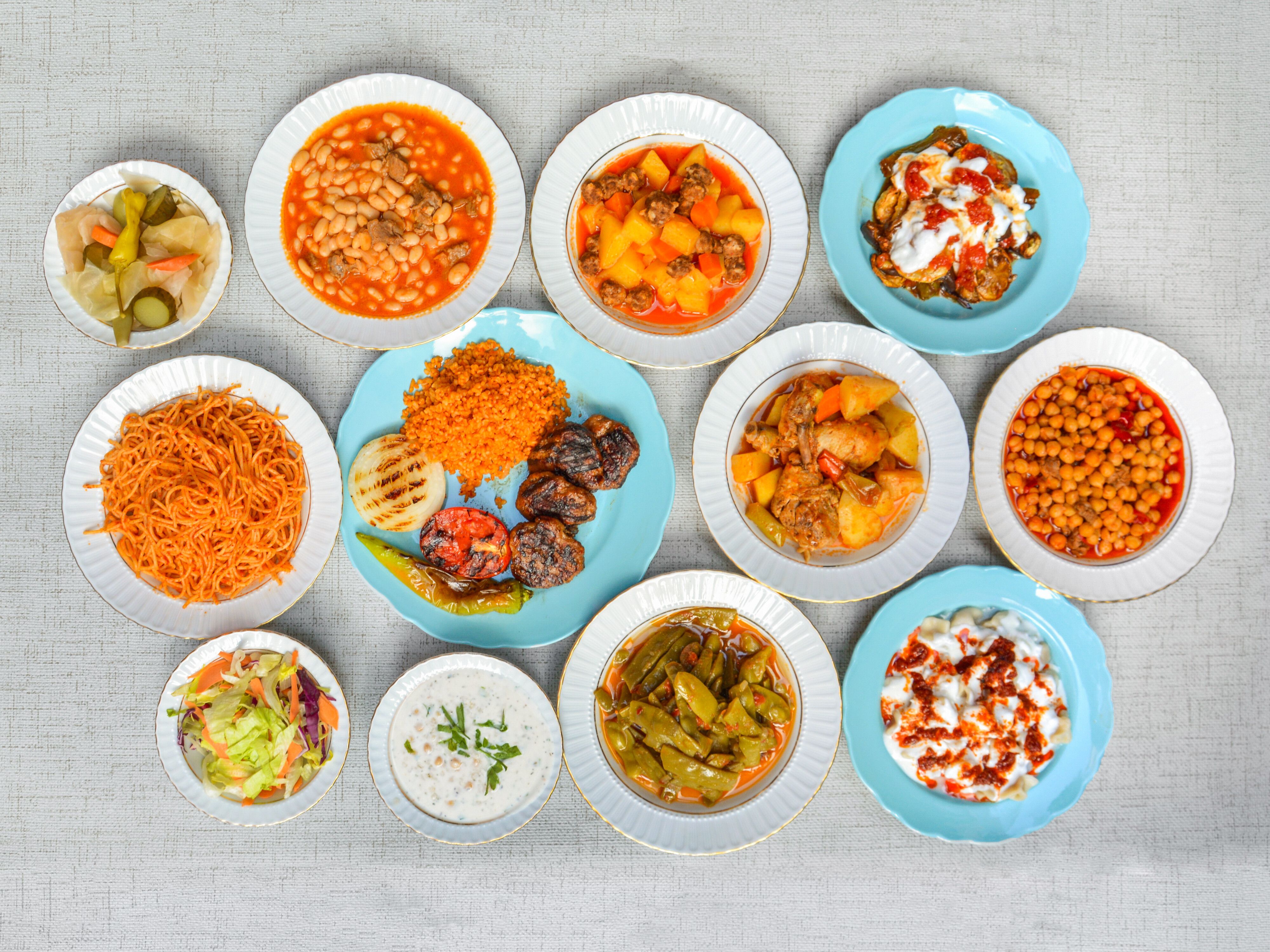 Patlıcan, yeşil biber, kırmızı biber, patates kızartmas, tam yağlı beyaz peynir, sarımsaklı yoğurt, karpuz, mevsi salata ile
