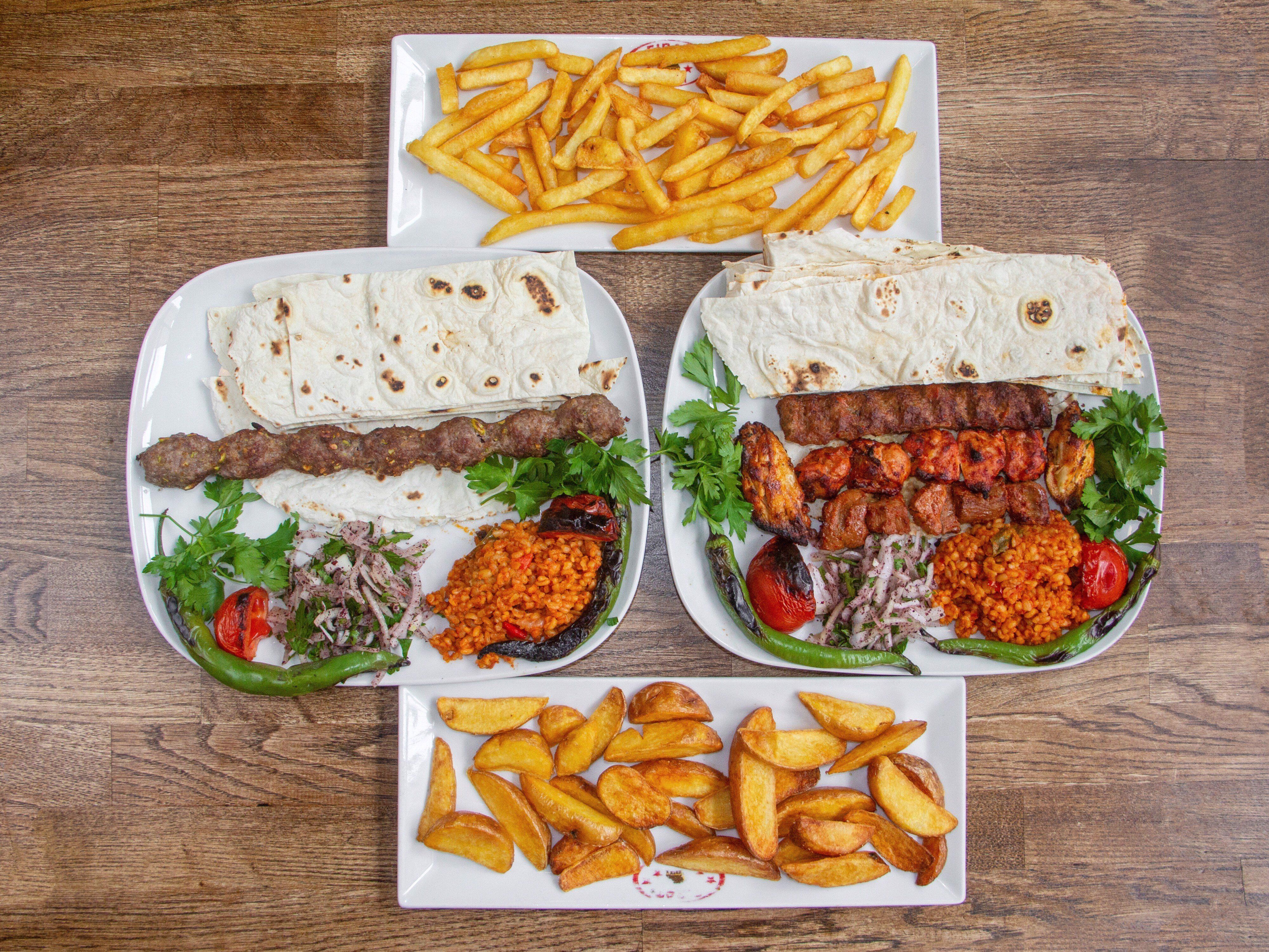 Adana, tavuk şiş, kuzu şiş, tavuk kanat, közlenmiş domates, közlenmiş yeşil biber, bulgur pilavı, sumaklı soğan, ezme salata, mevsim salata, lavaş ile
