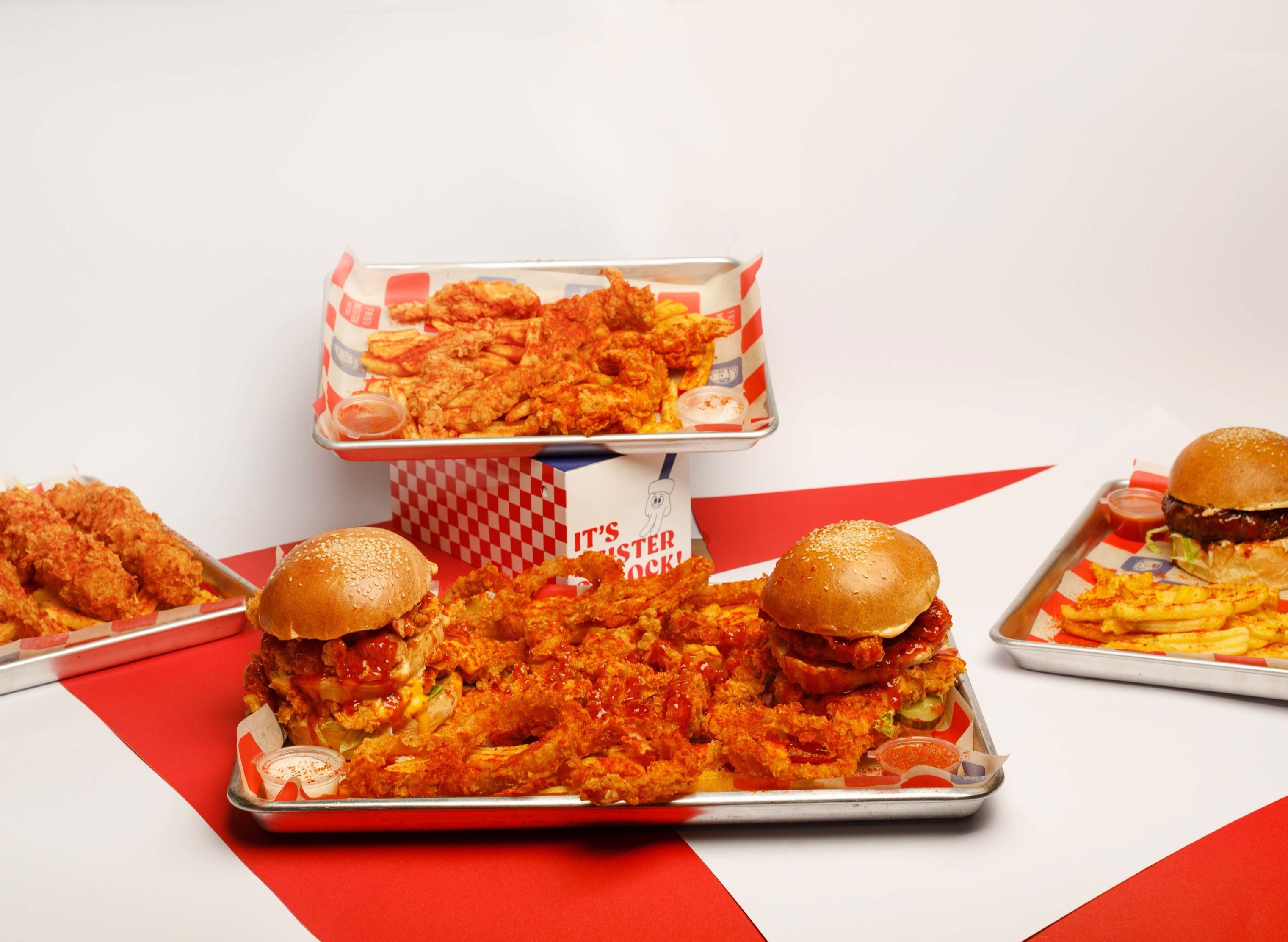 Kızarmış Meister tavuğu, hot chili sos, jalapeno biberi, Alman turşusu, iceberg marul, Meister dip sos. Patates kızartması, ketçap, mayonez ile