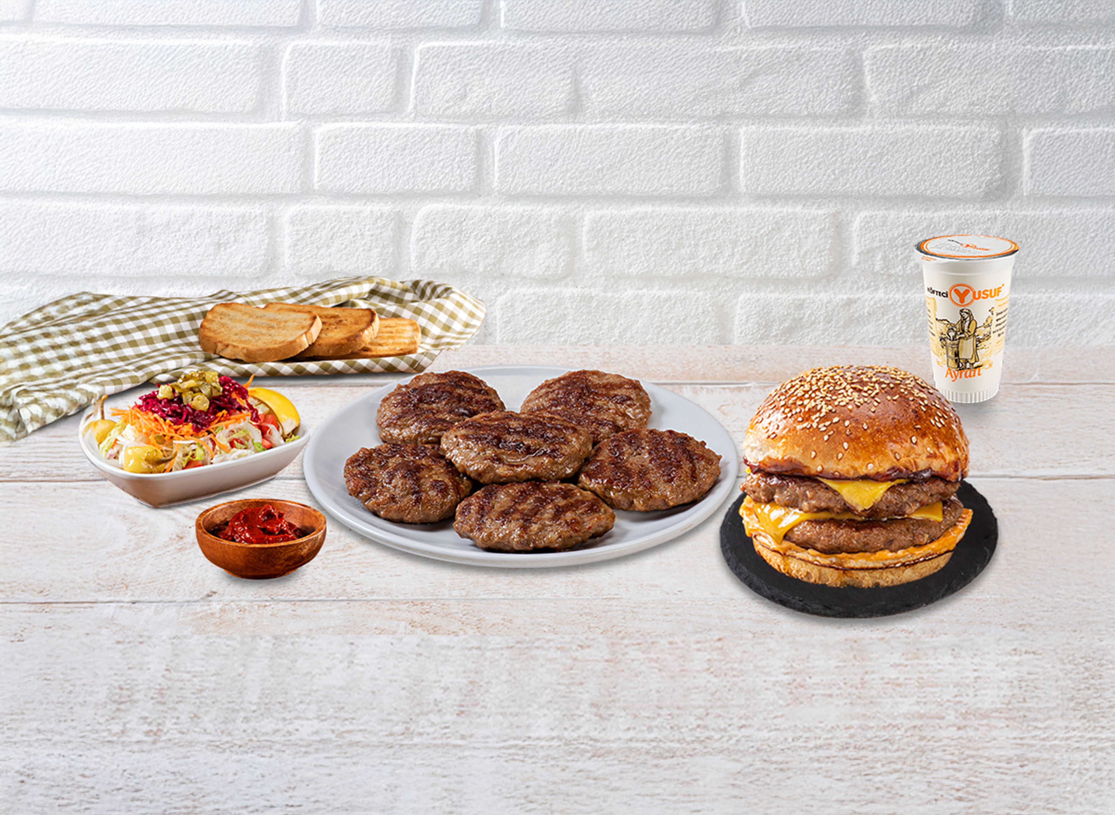 6 adet köfte, salata, ezme, ekmek ile