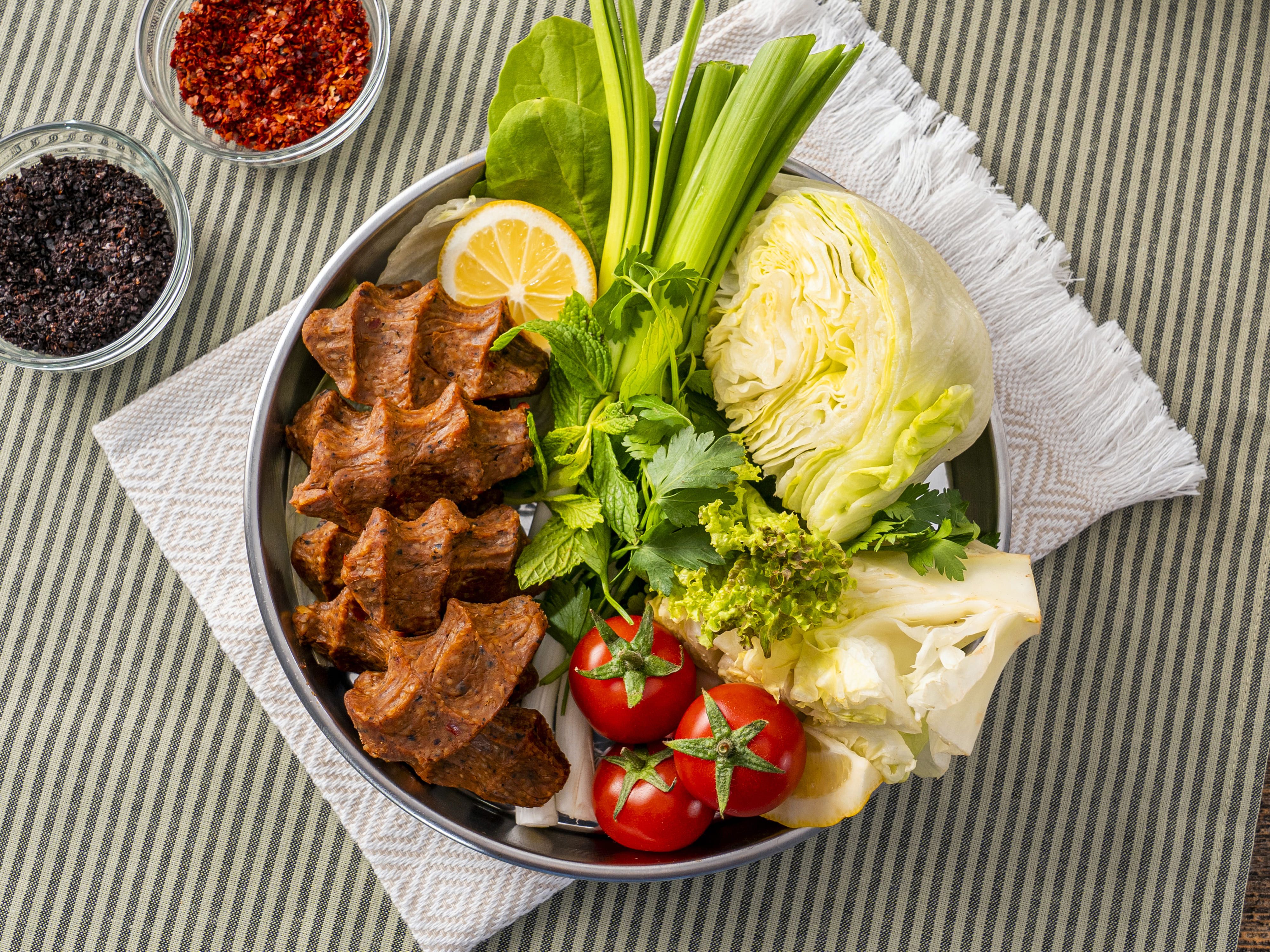 Yeşillik, maydanoz, limon, salatalık turşusu, domates, nar ekşisi, acı sos ile