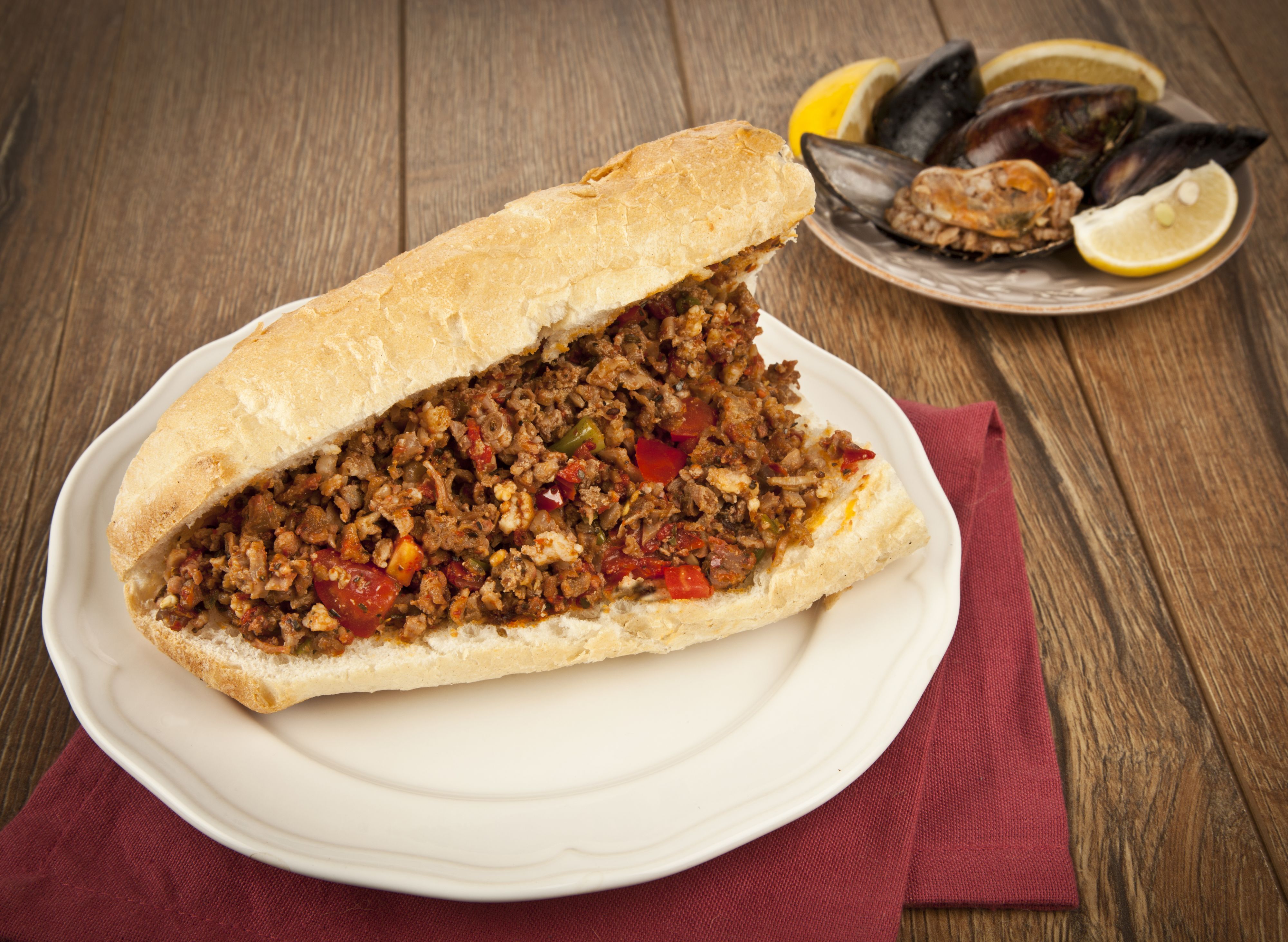 Burger köftesi, karamelize soğan, turşu, domates, ketçap, mayonez, marul
