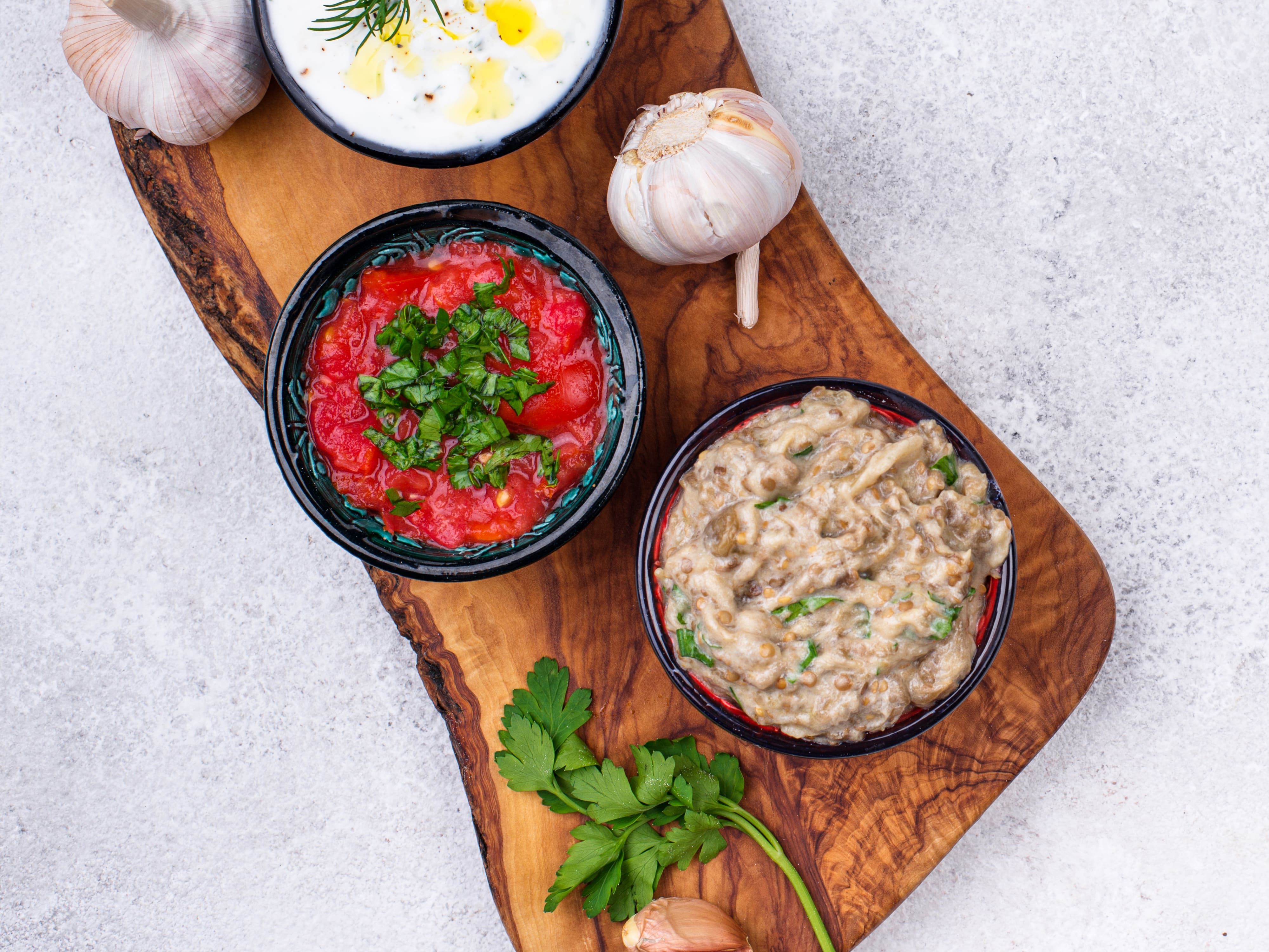 Süzme yoğurt, közlenmiş patlıcan, sarımsak, biber (200 gr. olarak servis edilir.)