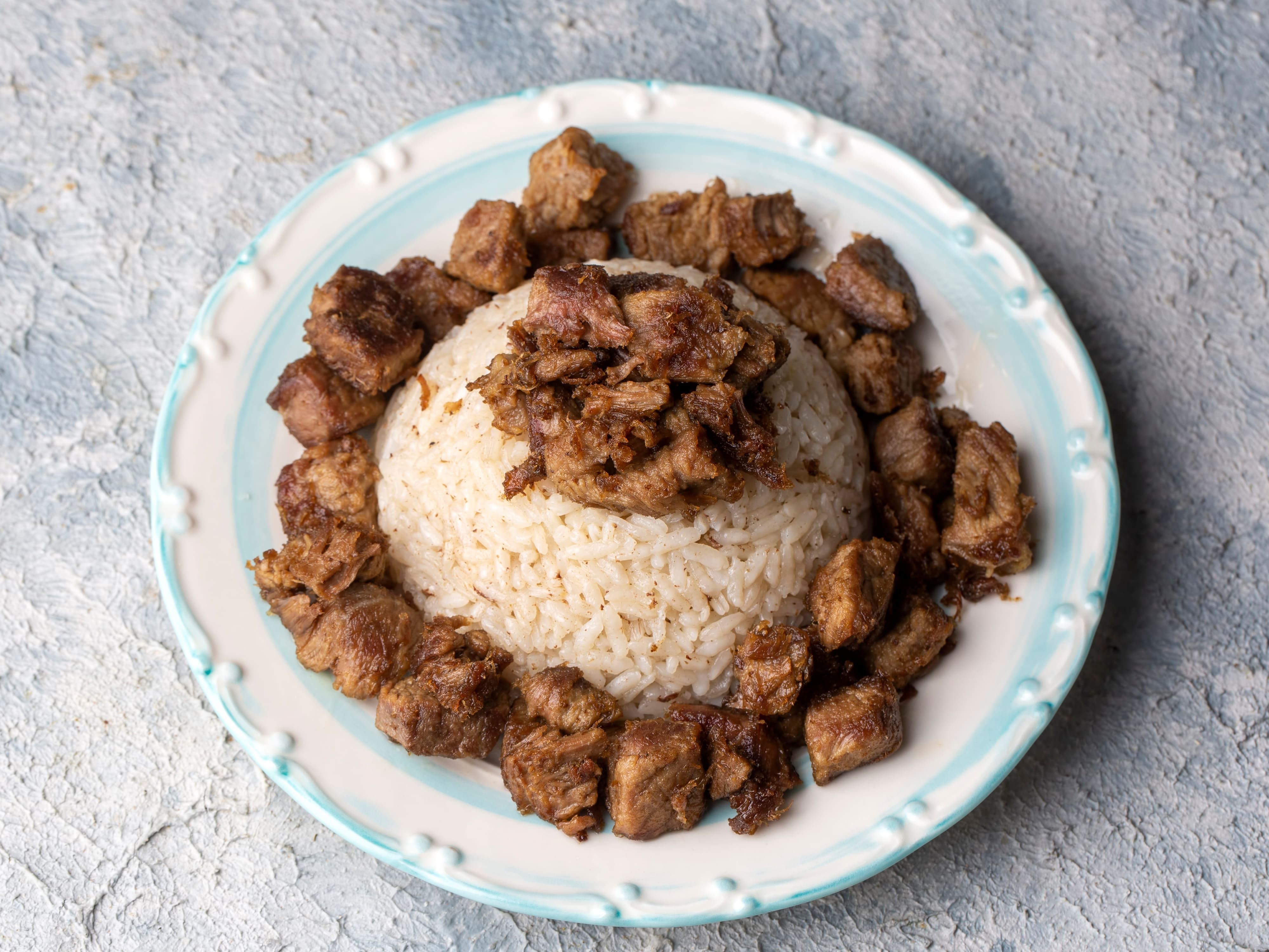 Pirinç pilavı üzerine; 100 gr. dana et kavurma. İsteğe göre ketçap, mayonez, biber turşusu ile