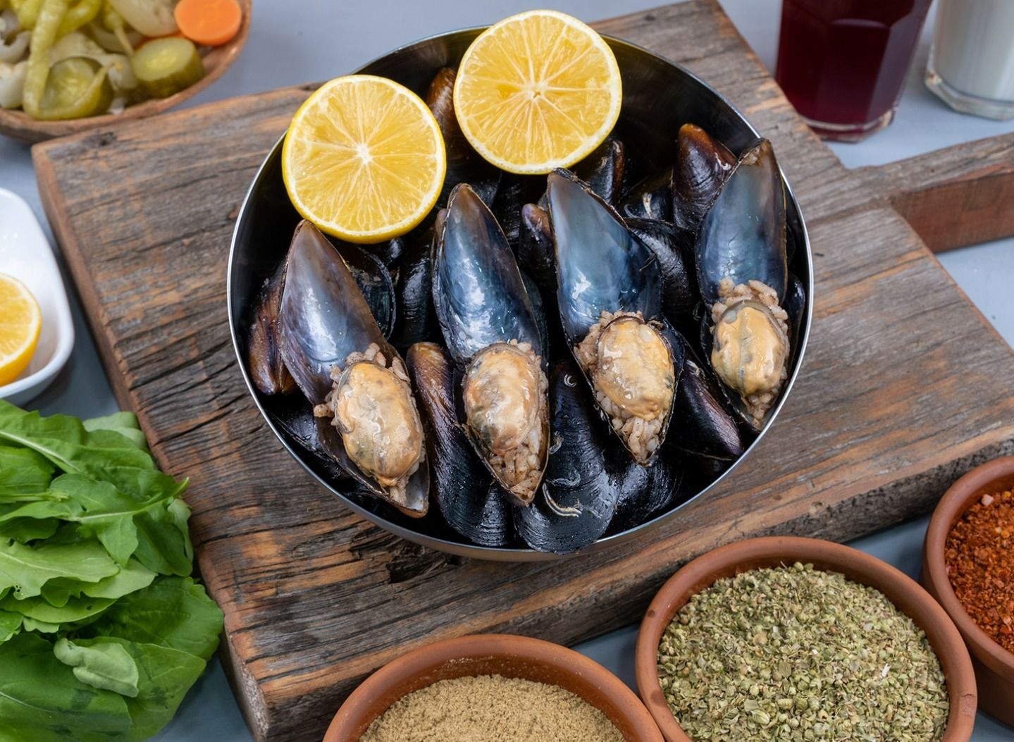 Domates, pul biber, kimyon, kekik. Salatalık turşusu, jalapeno biber turşusu ile