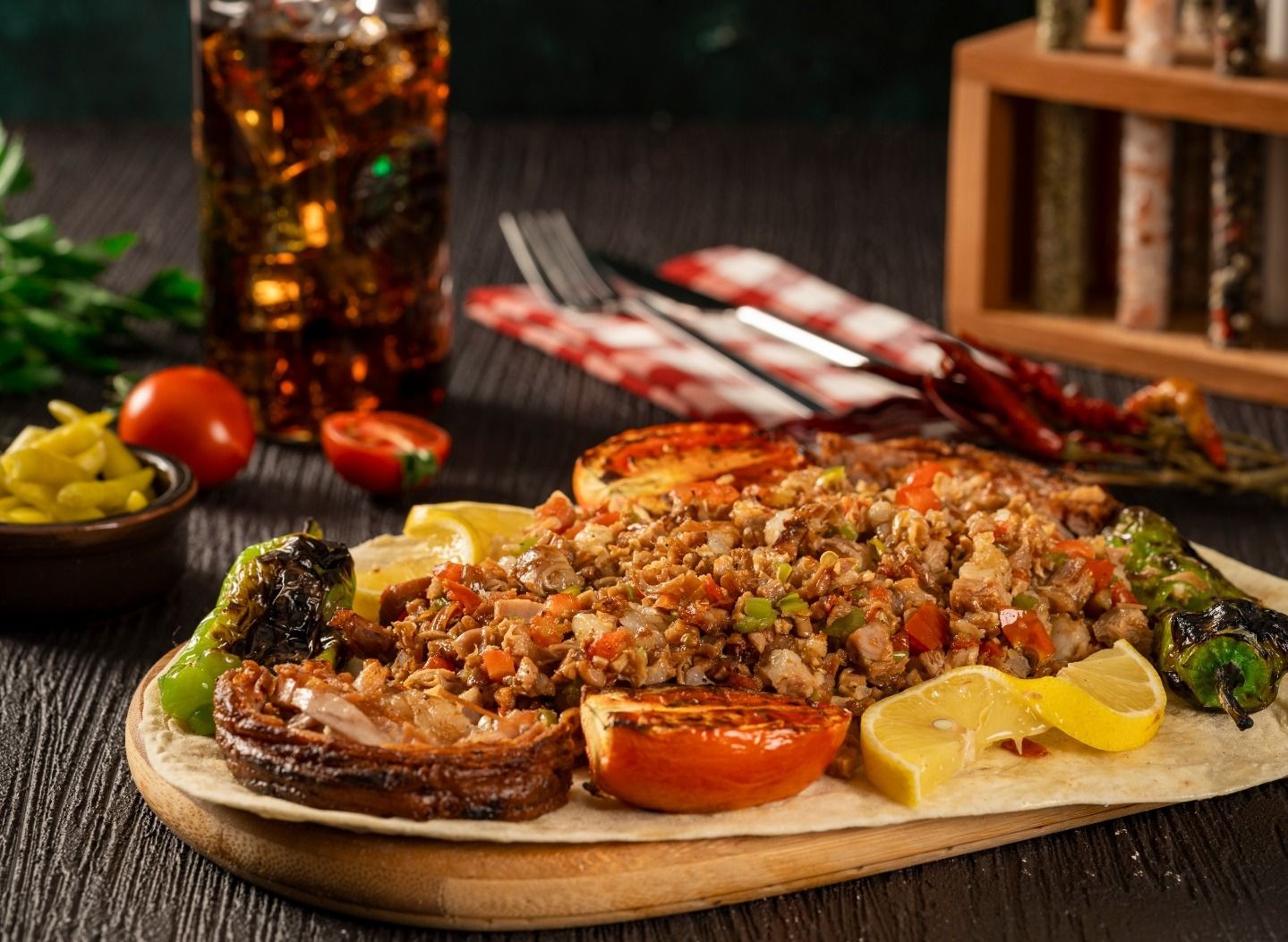 Odun ateşinde pişirilmiş lavaş üzeri ince ve irim kıyım kokoreç, közlenmiş domates, közlenmiş biber, baharat