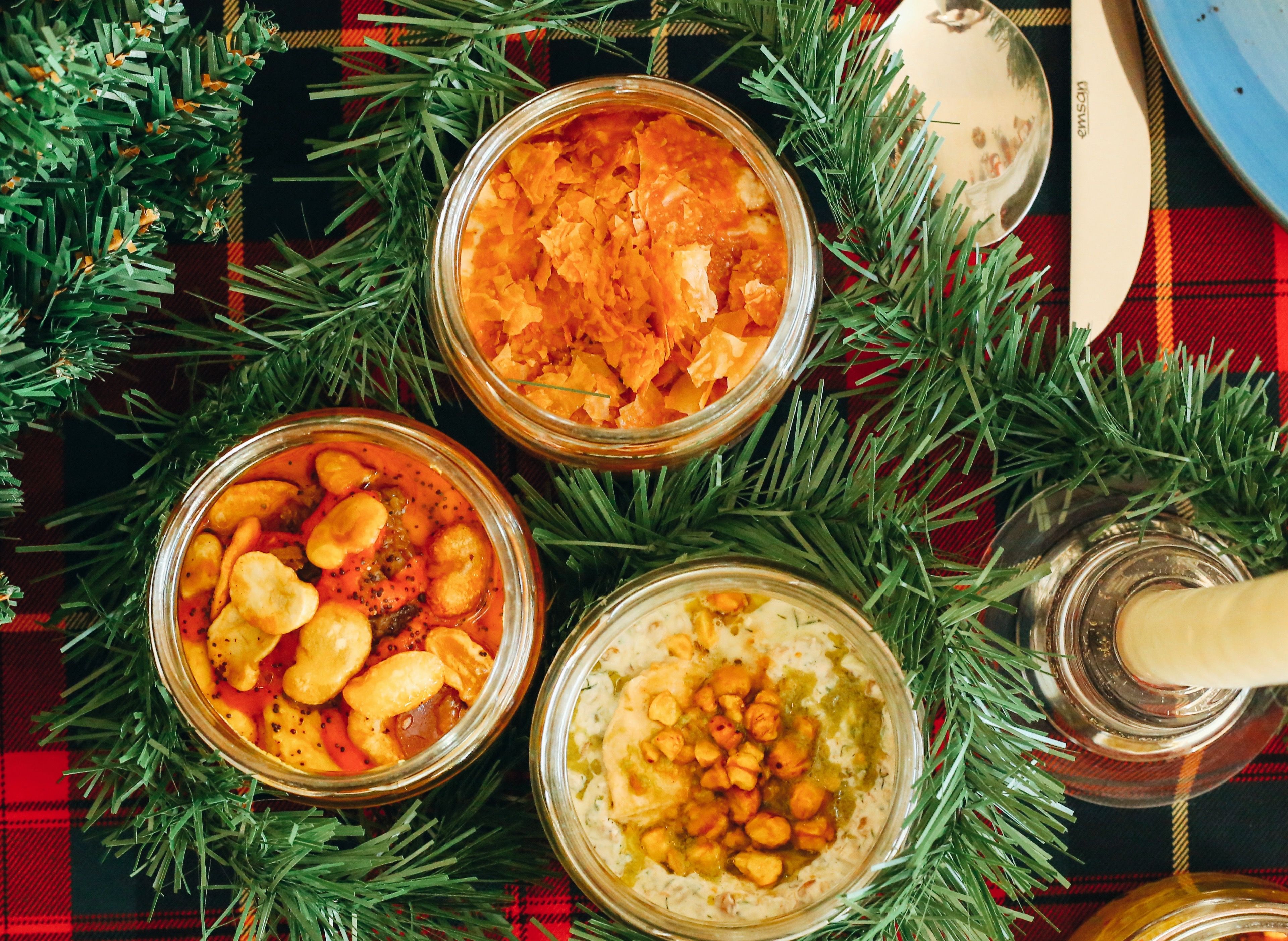 Çıtır nohut, lahana turşusu, enginar, közlenmiş biber, yoğurt sos