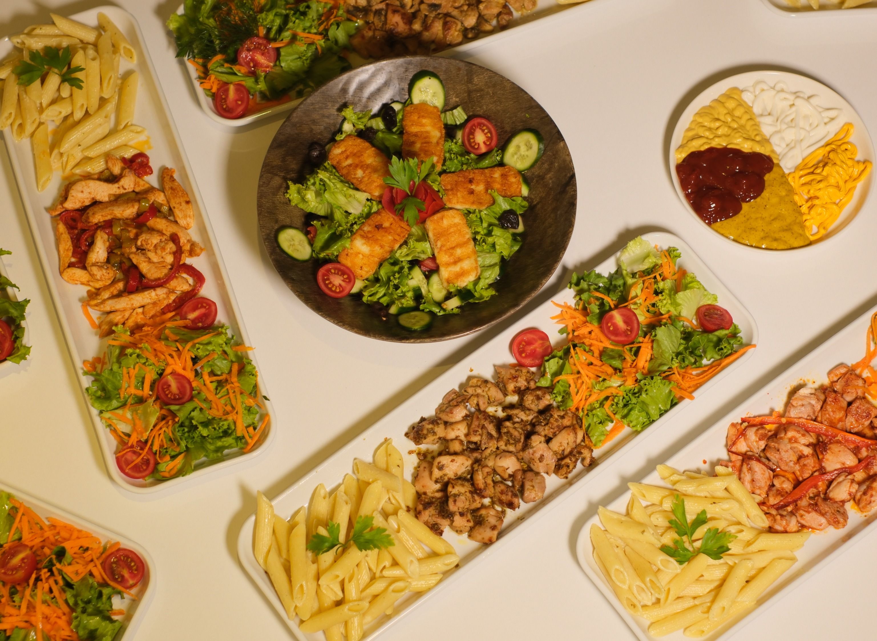Özel soslu tavuk, un. Pesto soslu makarna, mevsim salata ile