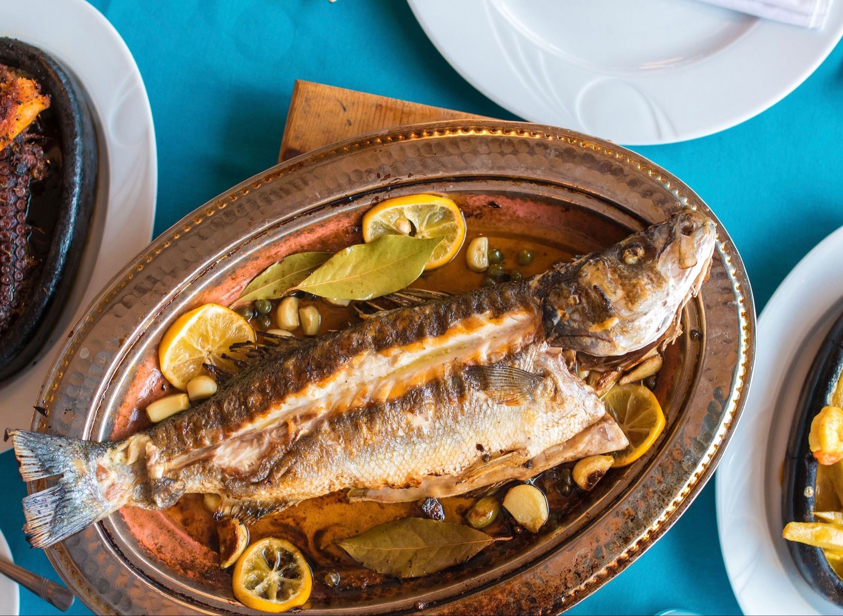 Kaya levreği, minekop, granyoz. Büyük Amasra salatası, 2 adet ekmek ile