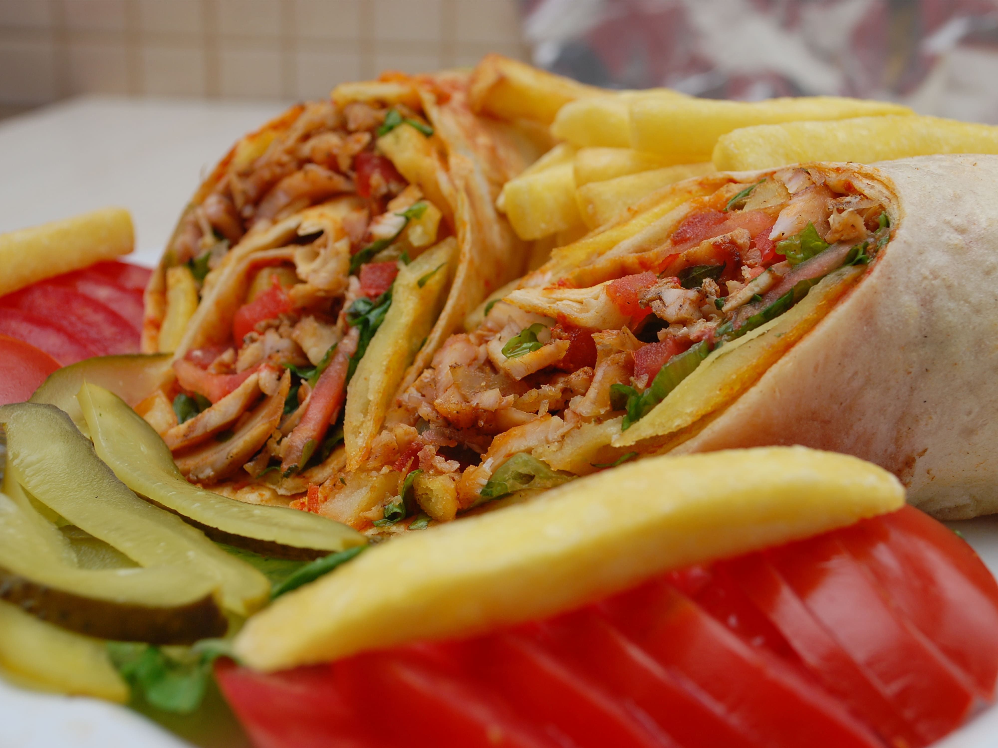 Tavuk döner, patates kızartması, turşu, sarımsaklı mayonez