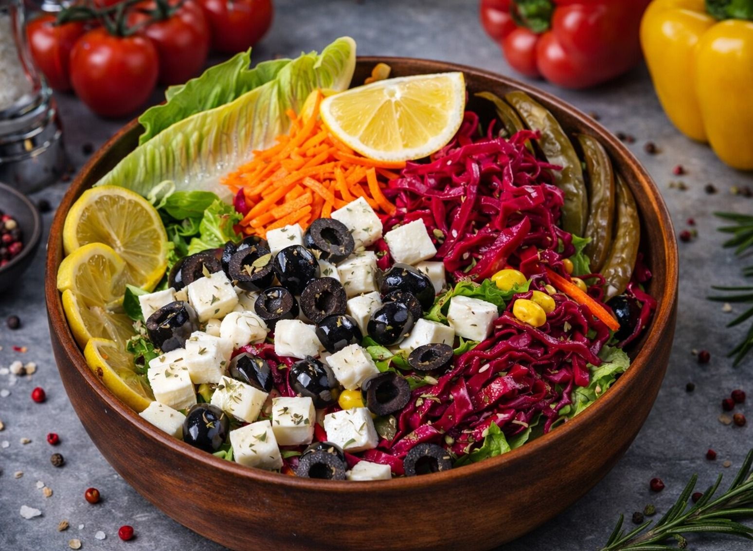 Haşlanmış tavuk, mevsim yeşillikleri, mısır, közlenmiş biber, salatalık turşusu, mor lahana turşusu, havuç