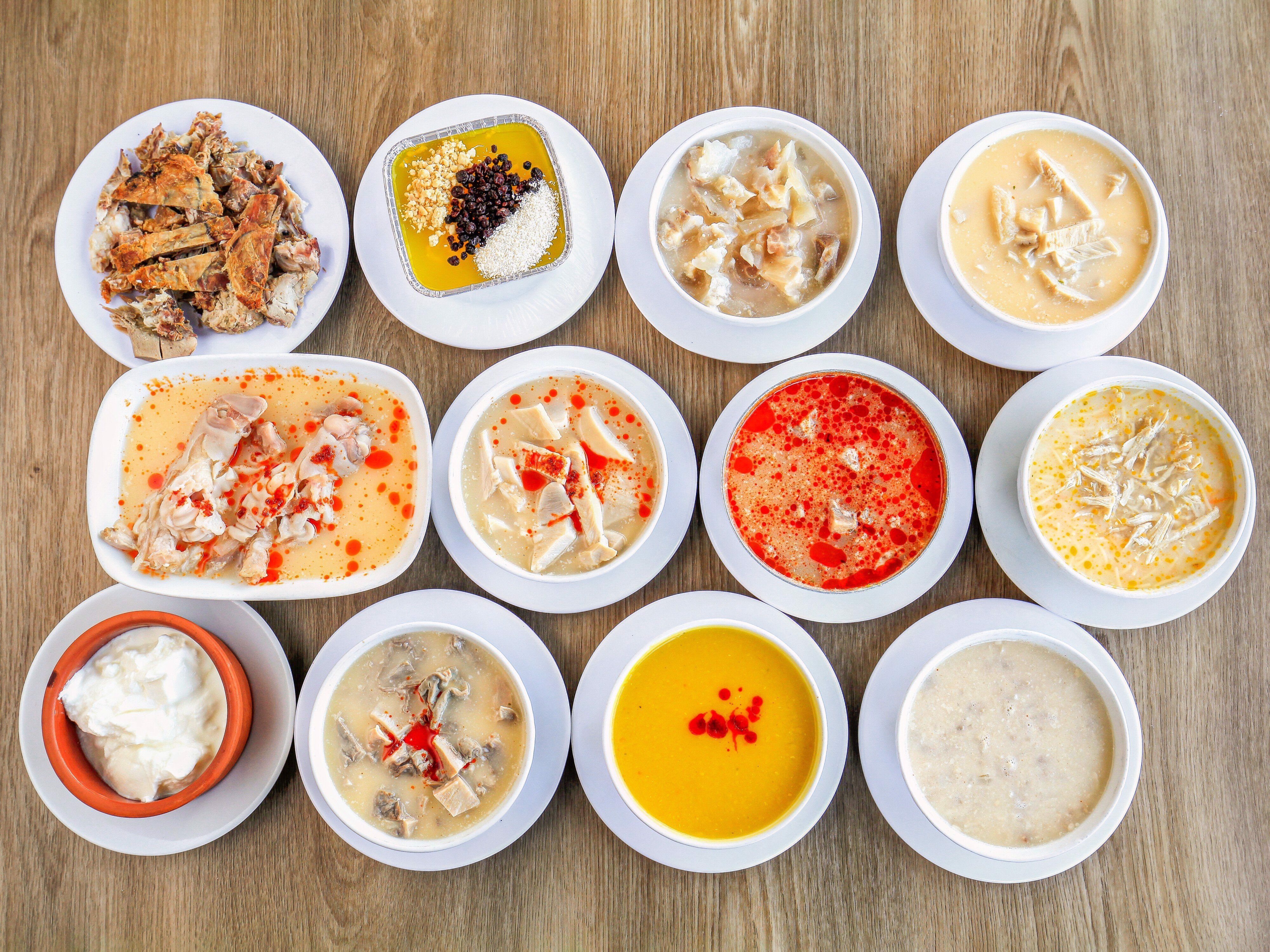 İşkembe, ayak, kelle, paça. Roka, acı sos, sarımsak sos, acı biber turşusu, limon, ekmek ile