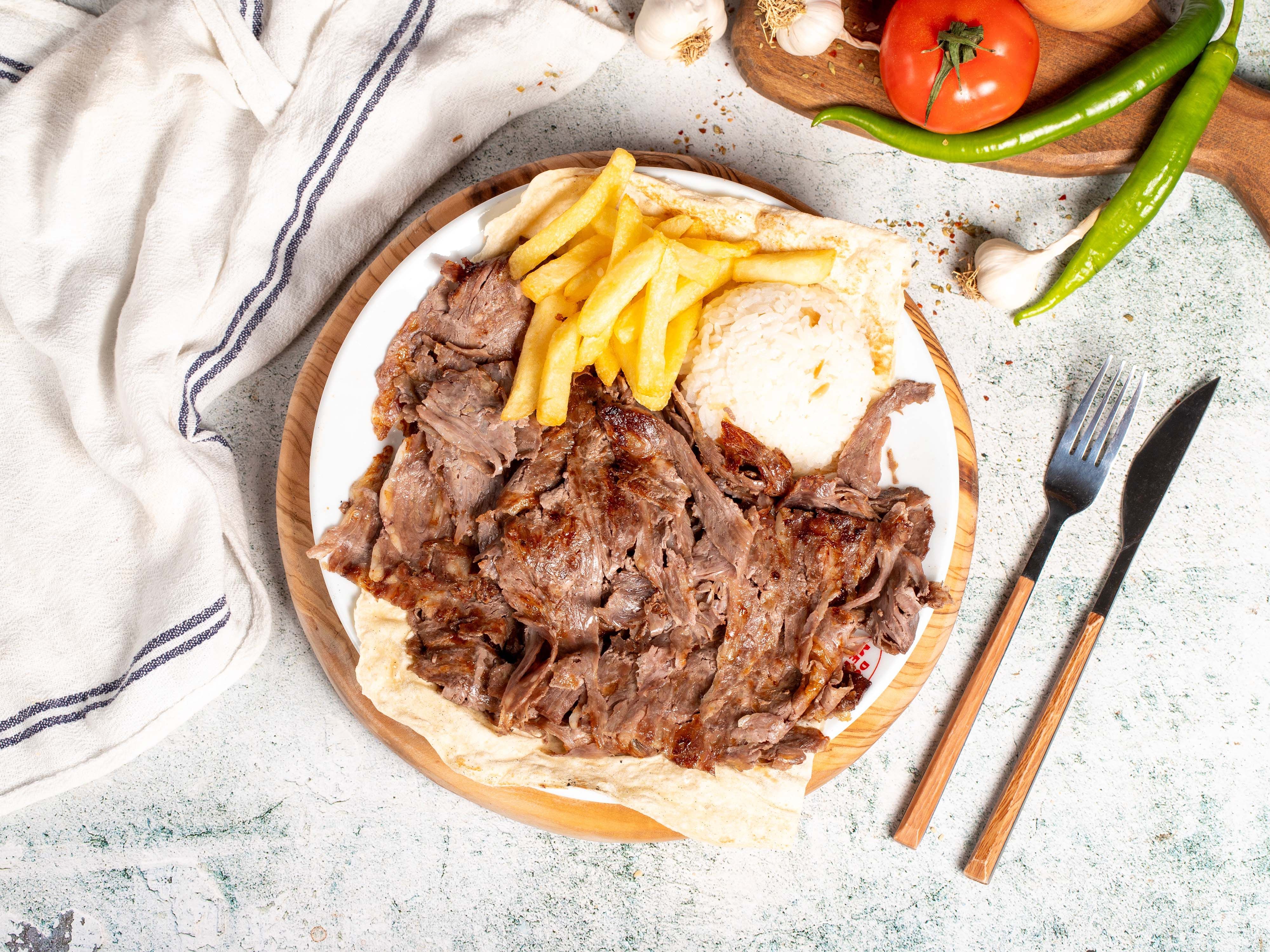 Et döner, patates kızartması, soğan, domates