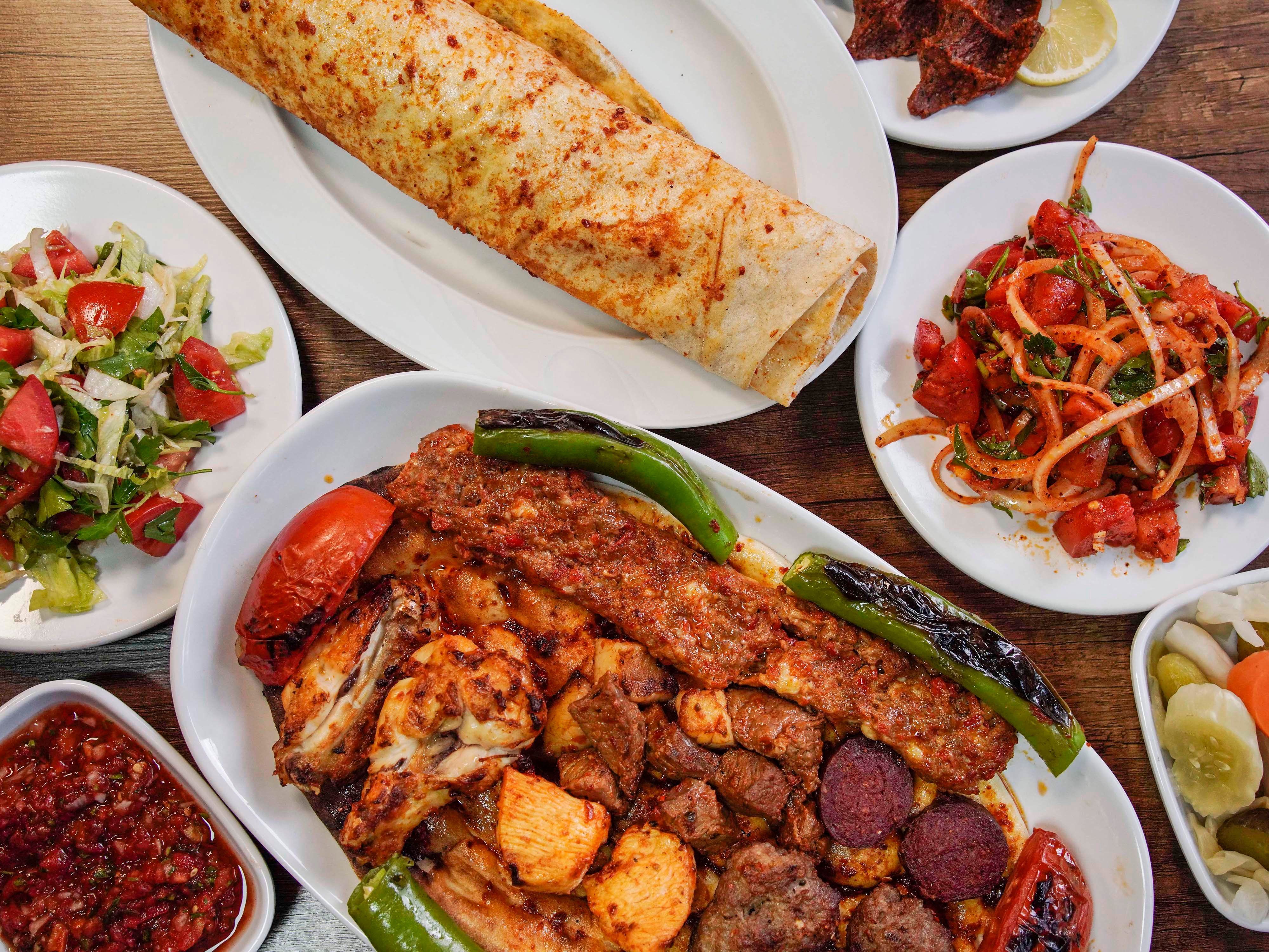 1/2 Adana kebap, 3 adet kanat, 3 adet tavuk şiş, 1 adet çöp şiş, 2 adet köfte. Acılı salata, acılı ezme, haydari, karışık turşu, çiğ köfte, tırnak pide ile