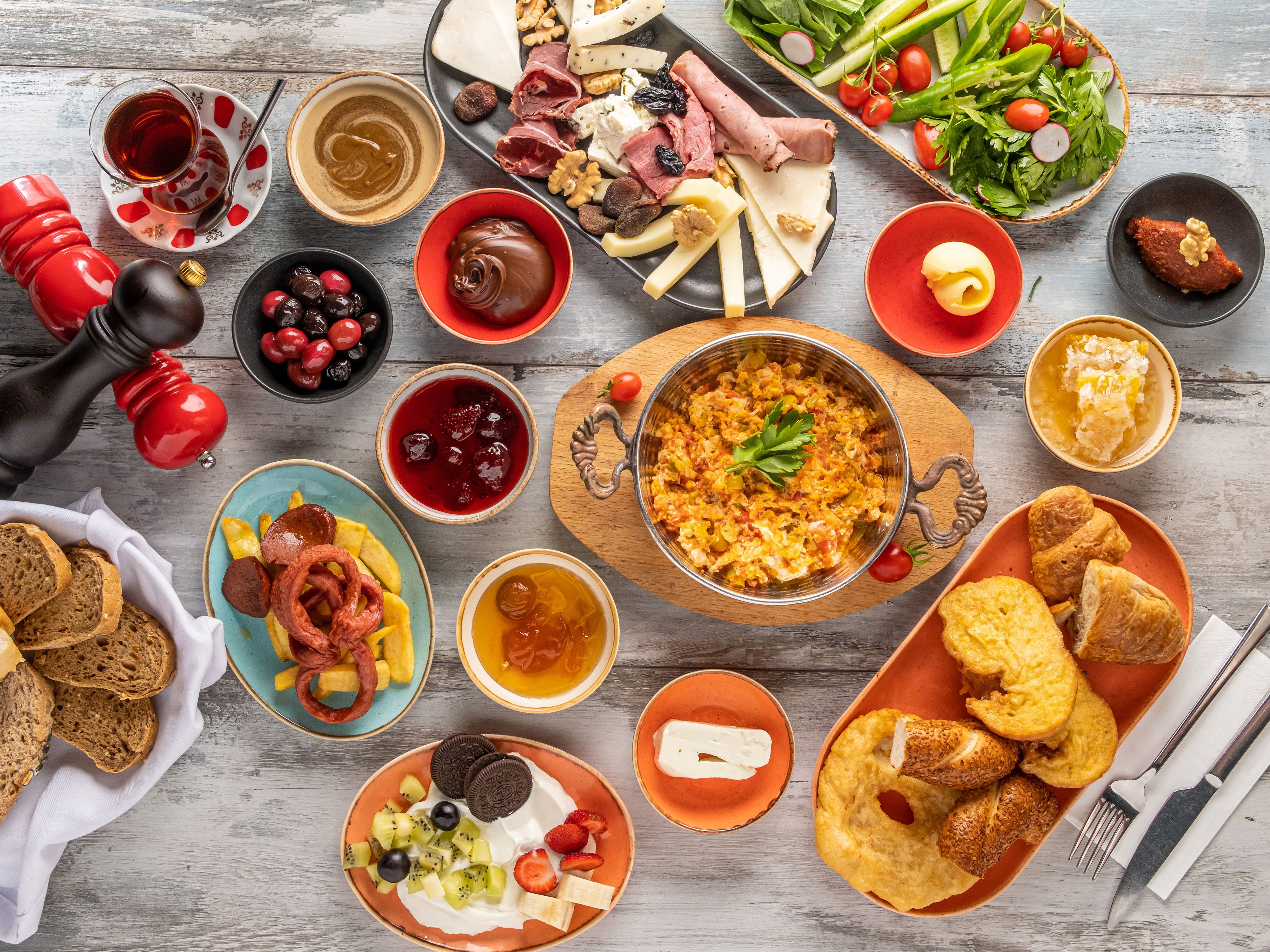 Domates, salatalık, beyaz peynir, siyah zeytin, tereyağı, bal, haşlanmış yumurta, ekmek