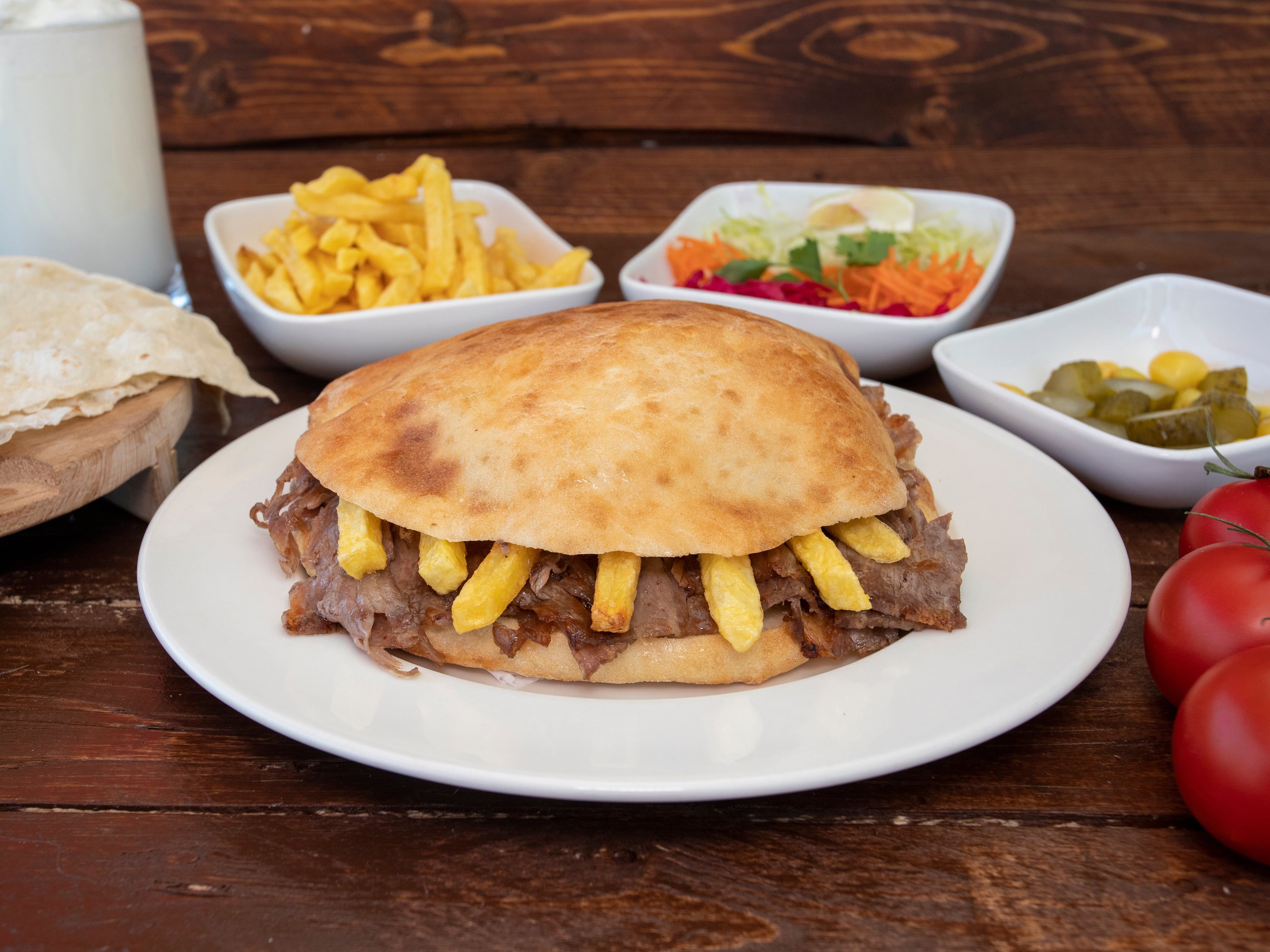 70 gr. tavuk döner, patates kızartması, domates, turşu