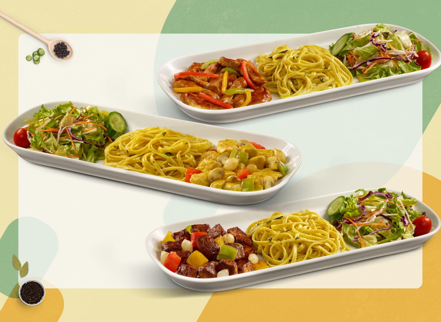 Makarna peynir sos, tavuk bonfile. Pesto soslu makarna ve salata ile servis edilir.