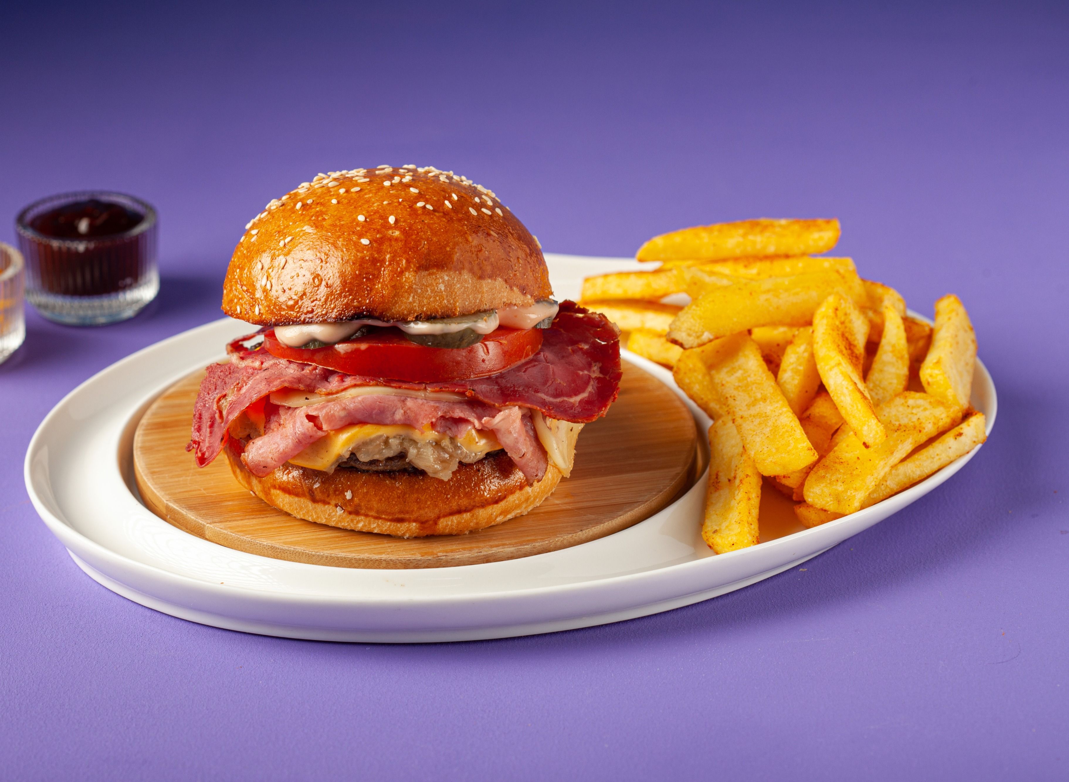 Burger köftesi (100 gr.), karamelize soğan, turşu, domates, cheddar peyniri, kaşar peyniri. Patates kızartması (Büyük) ile