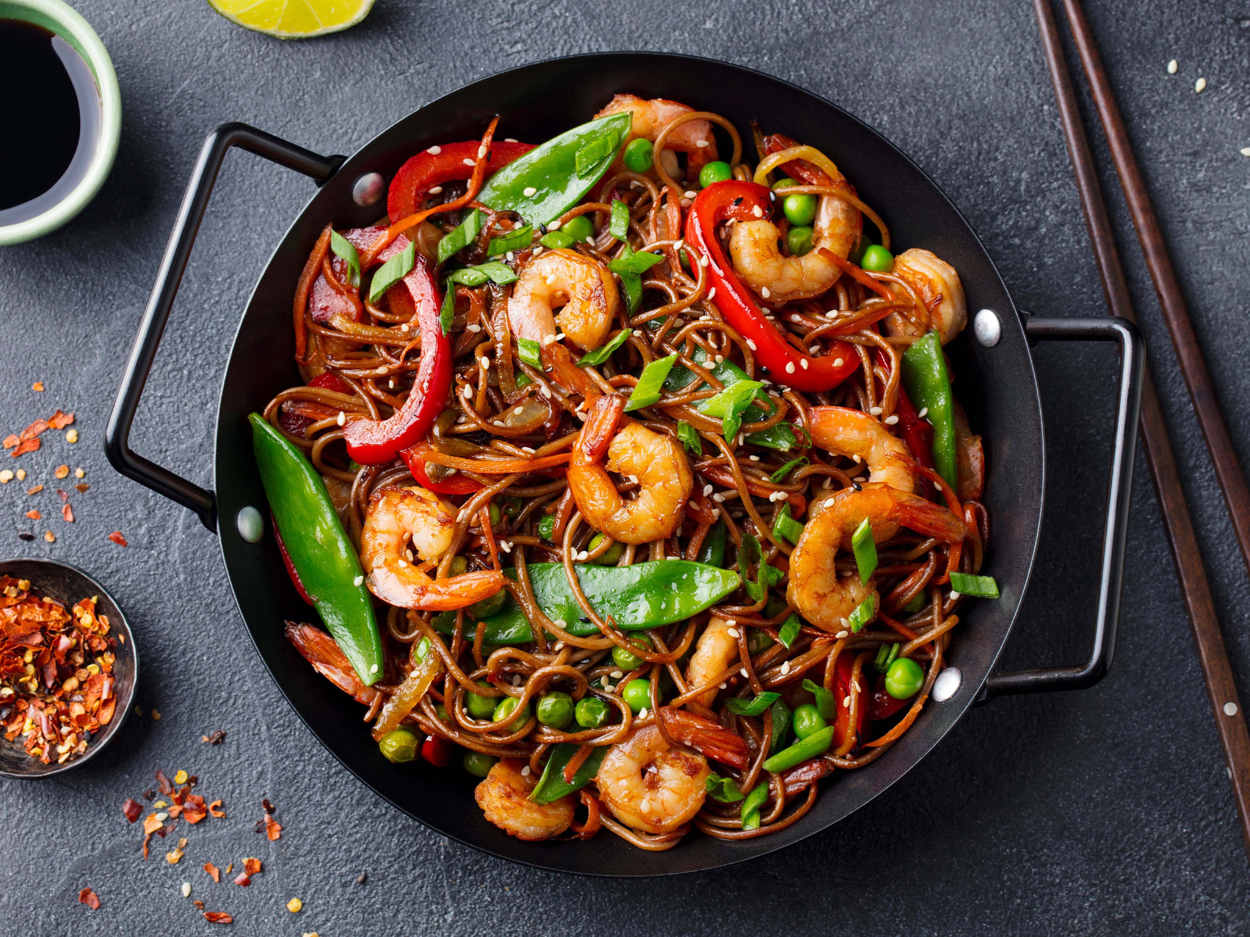Japon makarnası, brokoli, kabak, havuç, kapya biber, ıspanak, mantar, soya sos