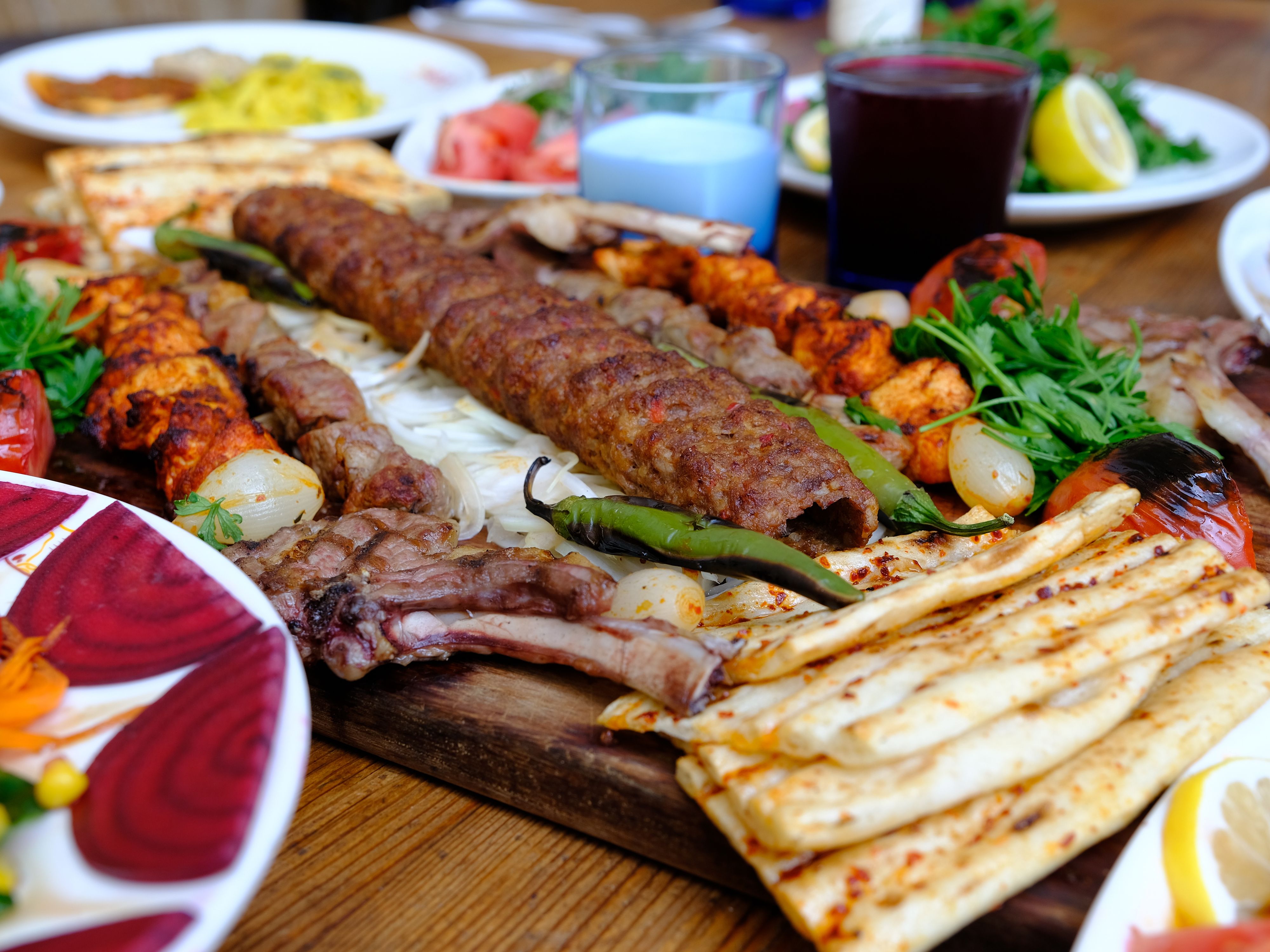 Adana kebap, tavuk şiş, et şiş, ciğer şiş. Acılı ezme, kızartma, içli köfte, bulgur pilavı, çiğ köfte ile