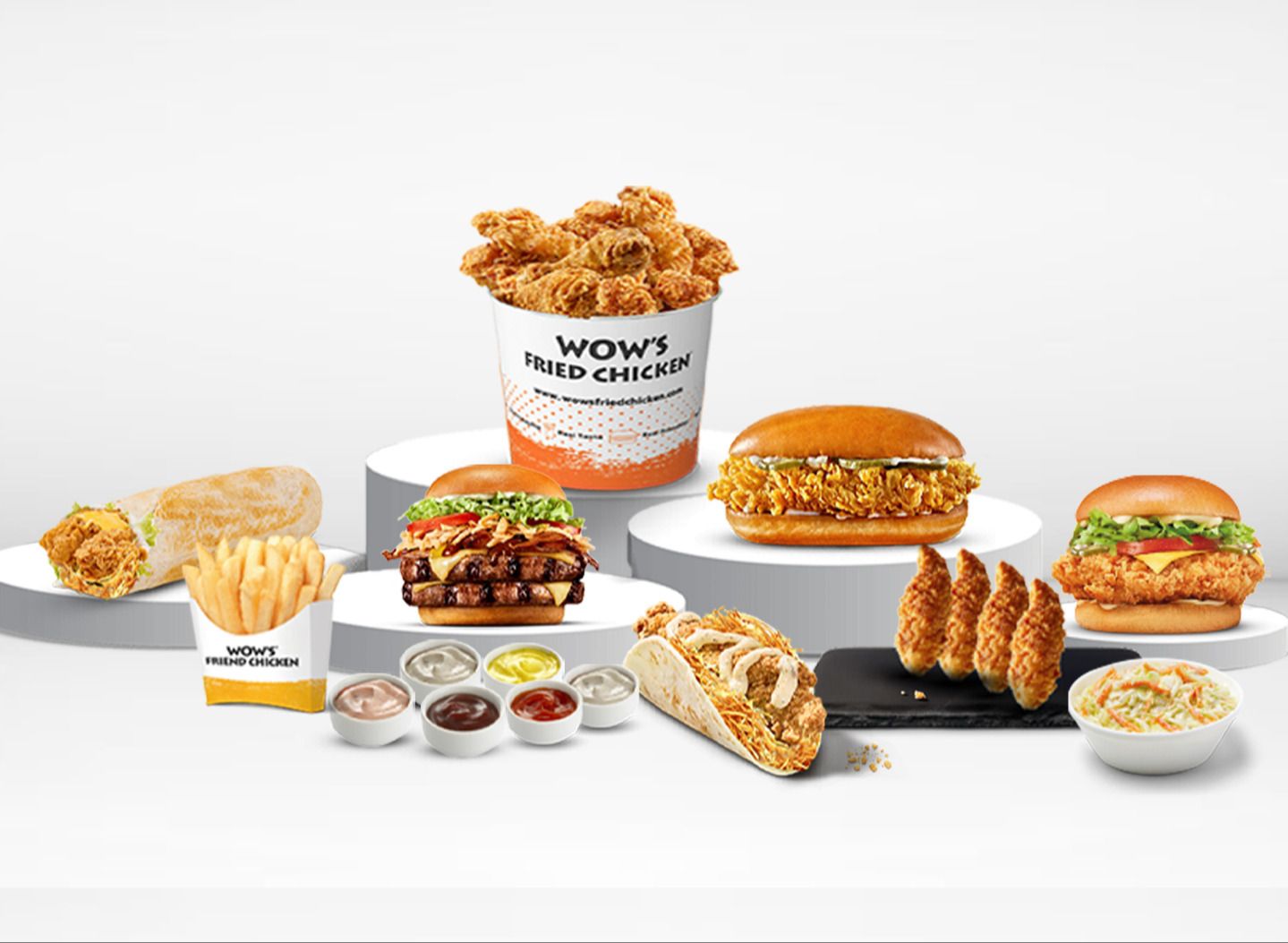 Gurme hamburger ekmeğine; 100-110 gr. tavuk tenders, özel Wow's sos, göbek salata, kibrit patates kızartması, cheddar sos
