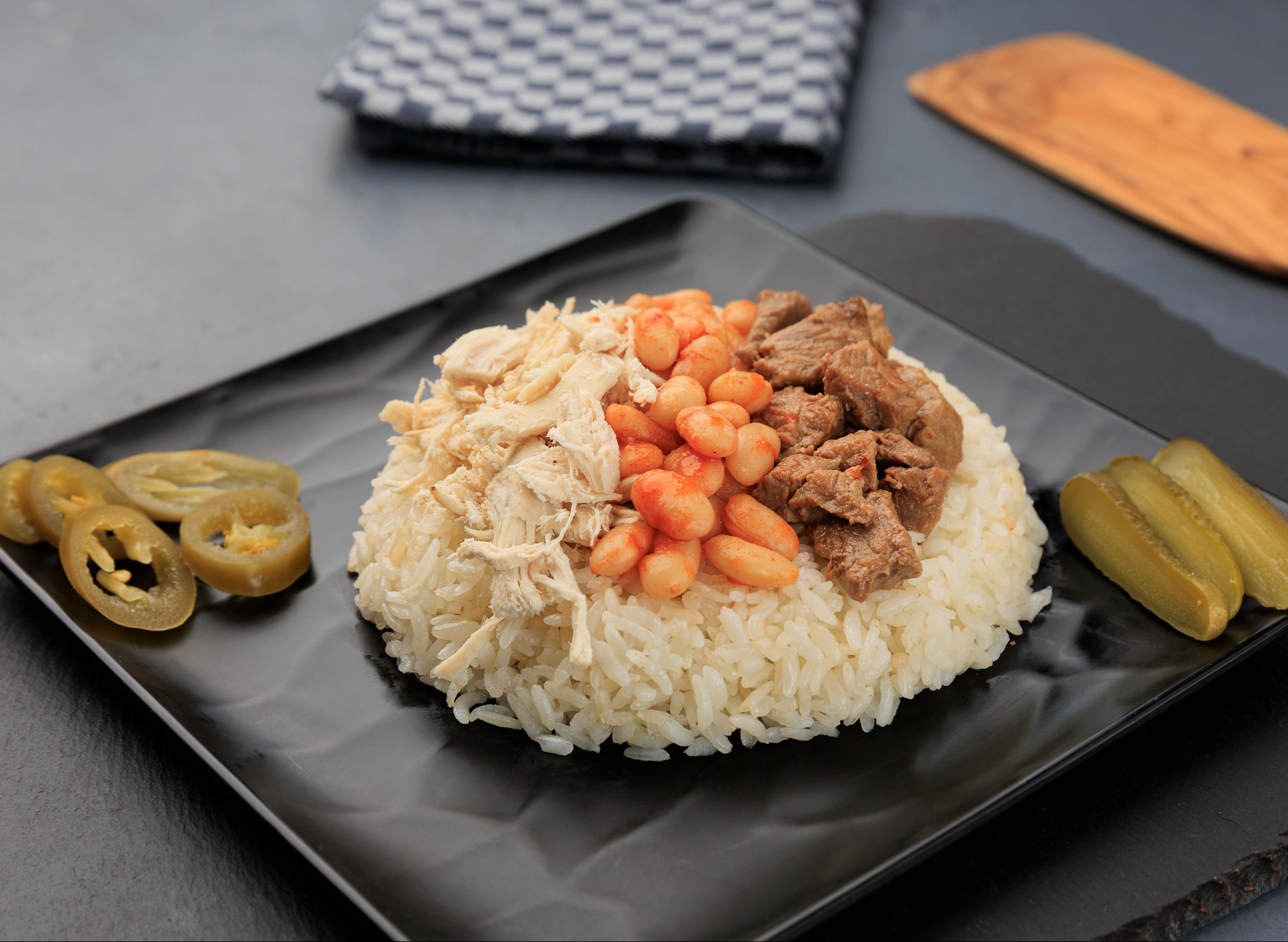 Tavuk, kuru fasulye, kavurma. Jalapeno biberi, kornişon turşu ile